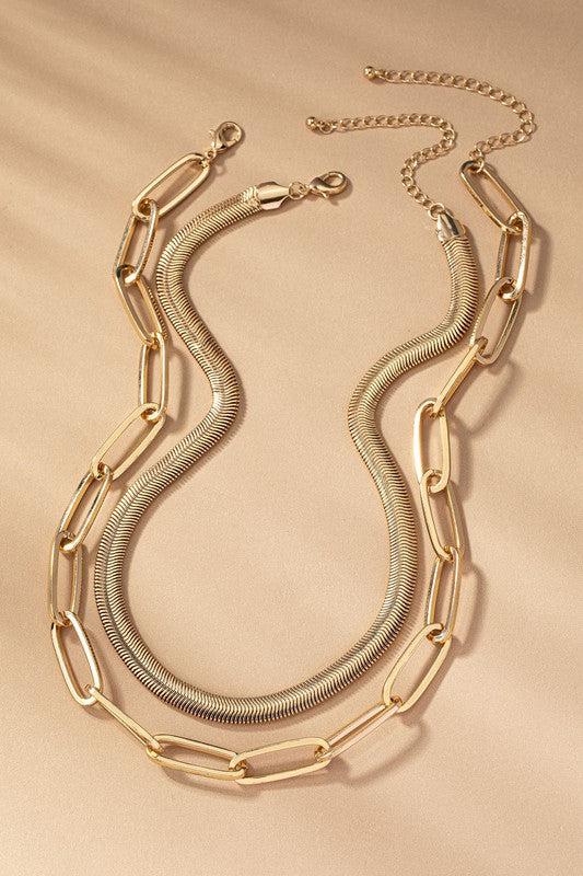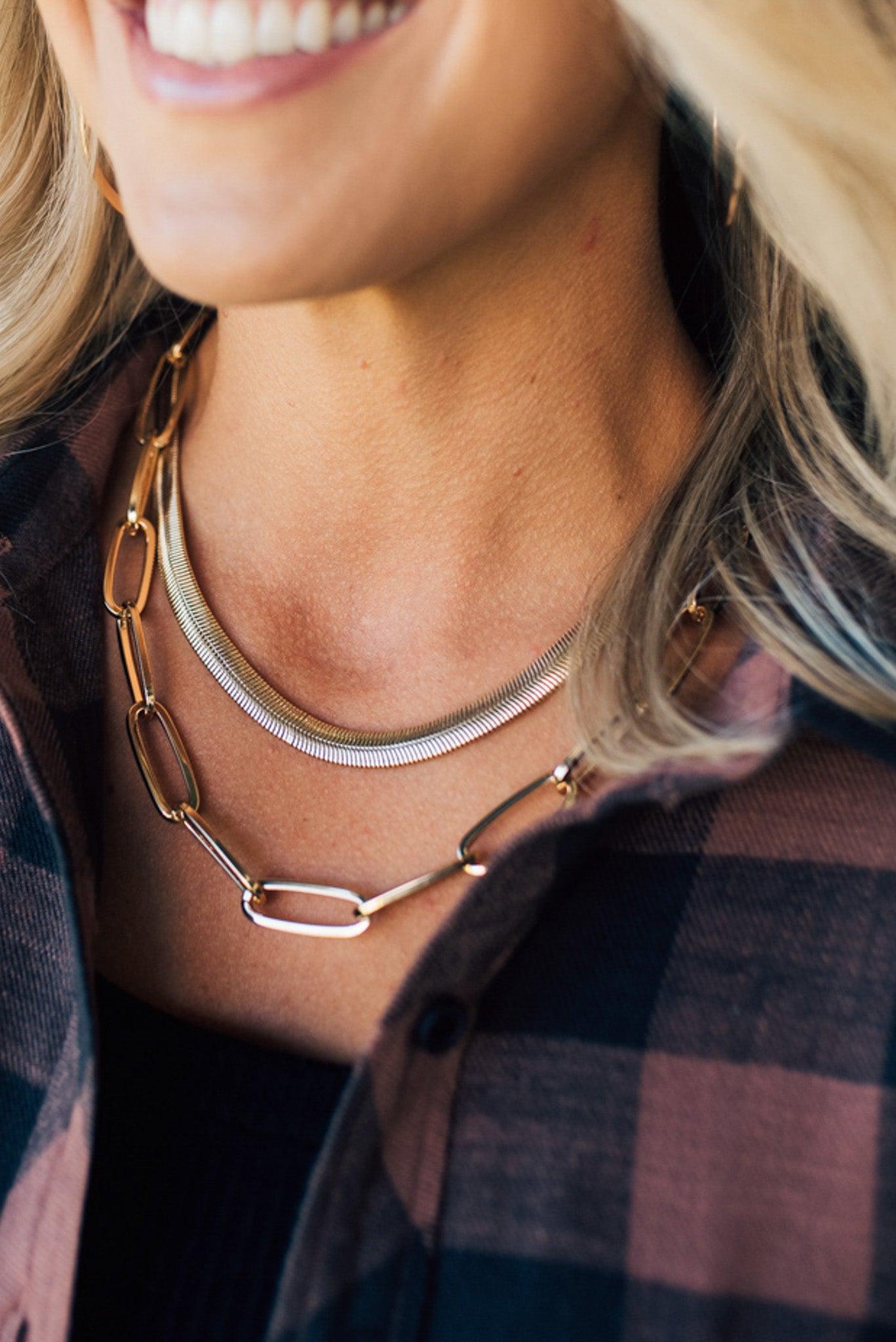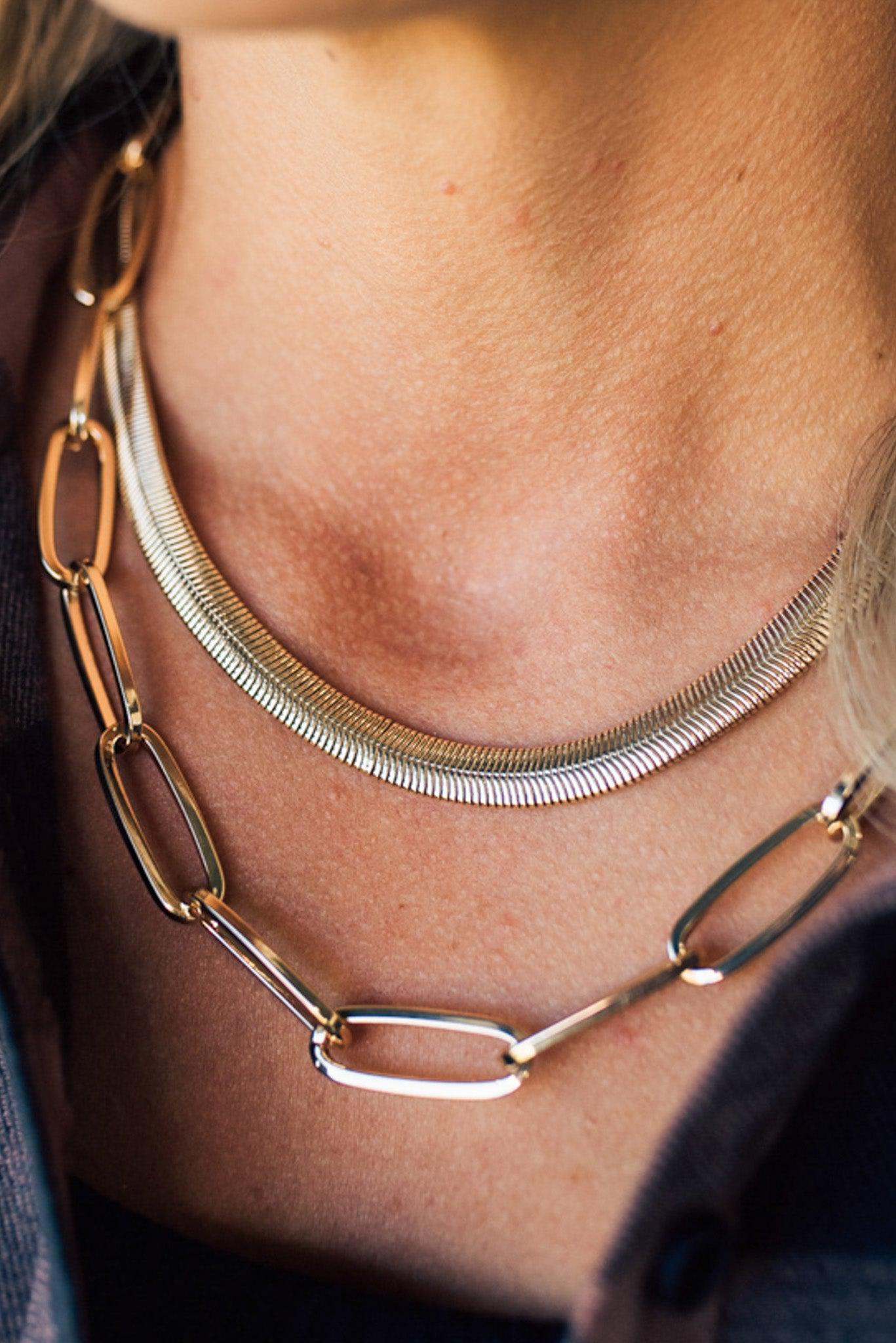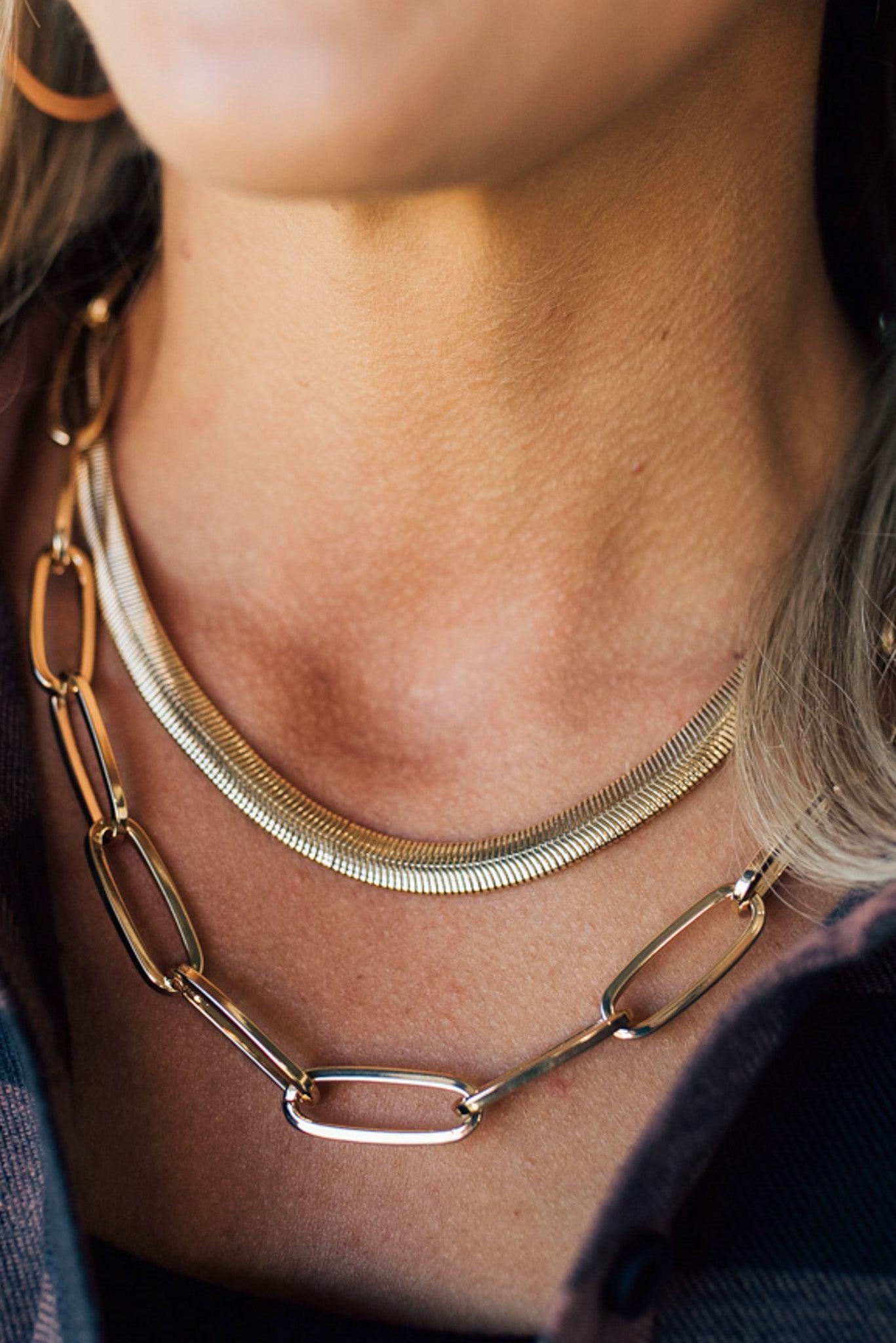 This Herringbone + Chunky Link Necklace set features two quality brass chains - a chunky paper clip chain and a smooth chunky snake chain. Its simple design makes it perfect for everyday wear, while together, or seperated, this will add a statement piece to any outfit.