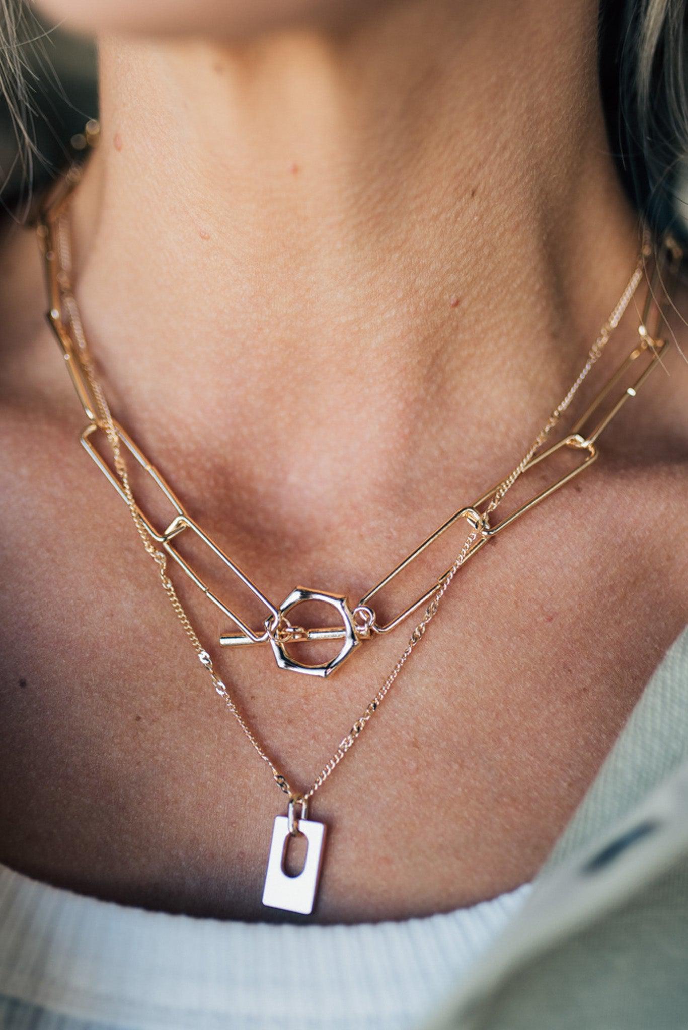 Enhance any outfit with the versatility and style of our Link Layered Necklace. This two row necklace features a unique link chain with a secure hexagon toggle closure, paired with a delicate chain and cut out dog tag. Elevate your look with this elegant and modern accessory.