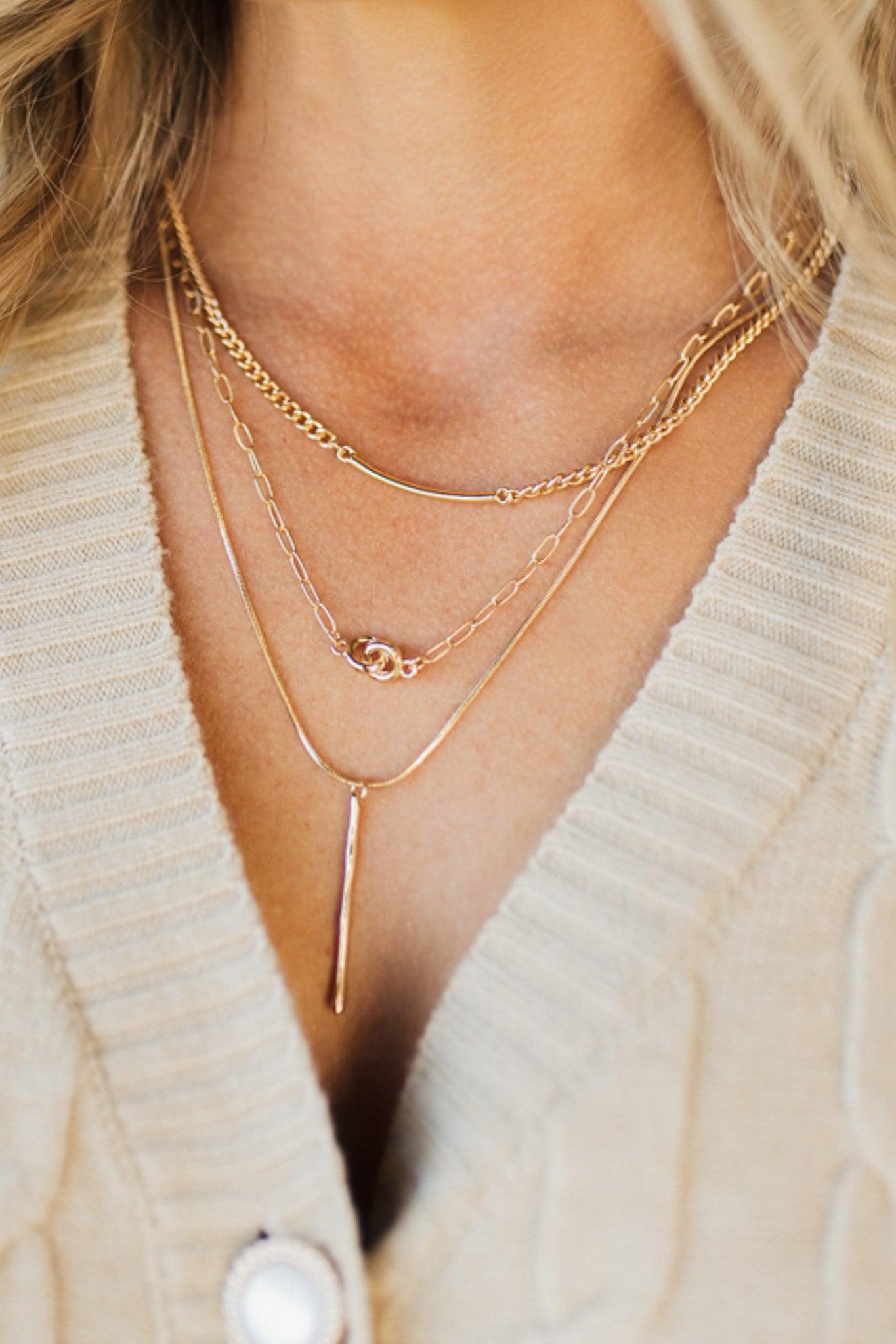 Upgrade your necklace game with this triple strand accent necklace. Featuring a mix of cuban, paper clip, and snake chain, this necklace is both stylish and versatile. The curve bar, knot, and long stick add unique flair to any outfit. Three chains, endless compliments. (Get ready to turn heads with this triple threat necklace!)