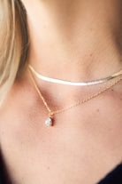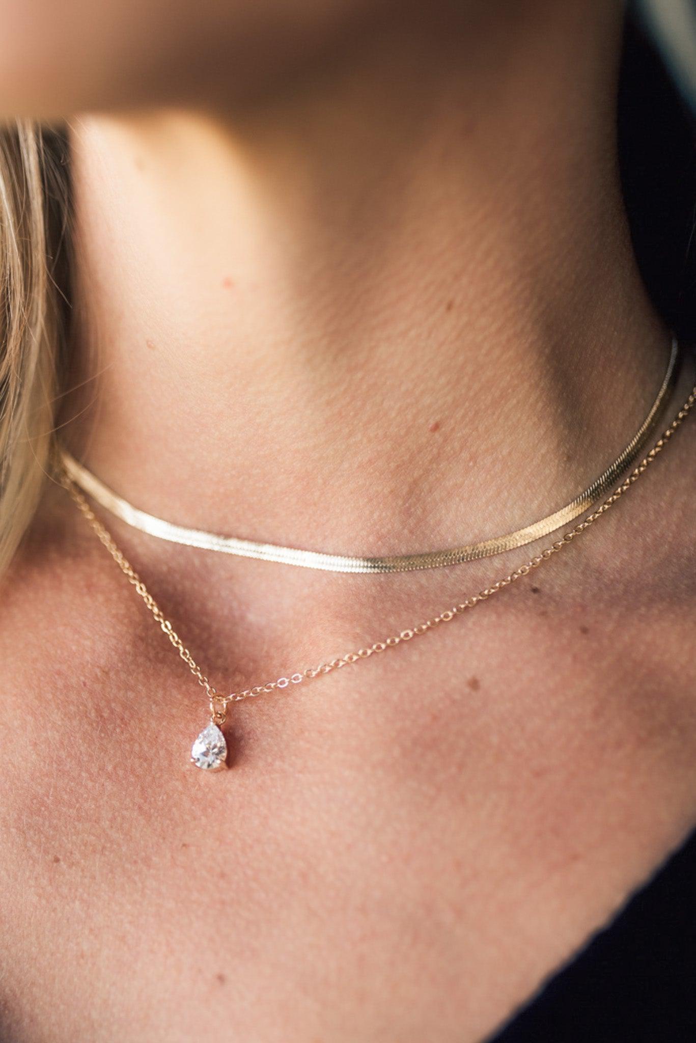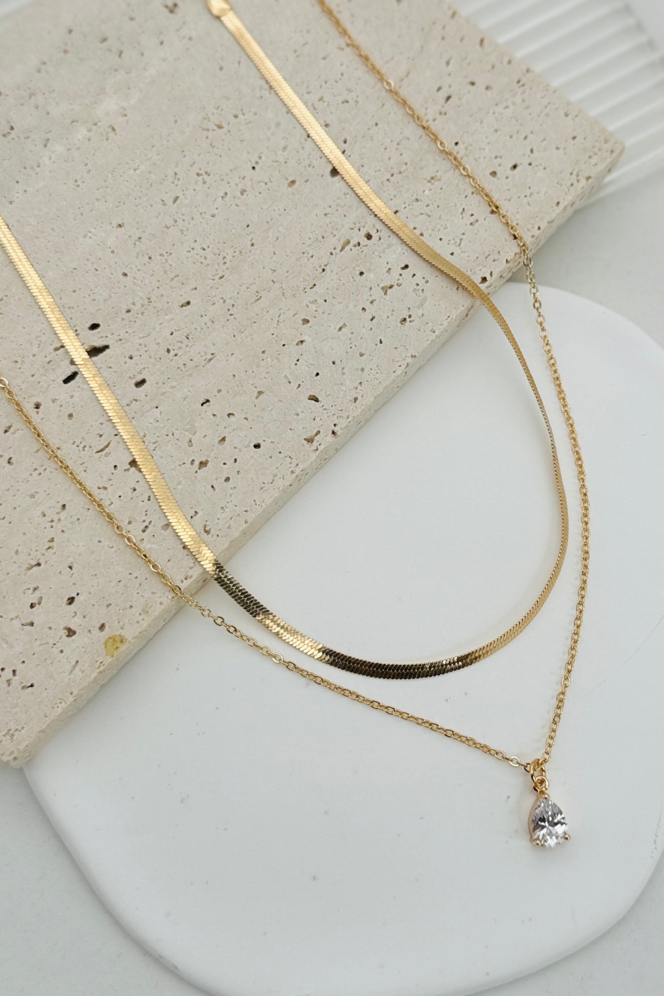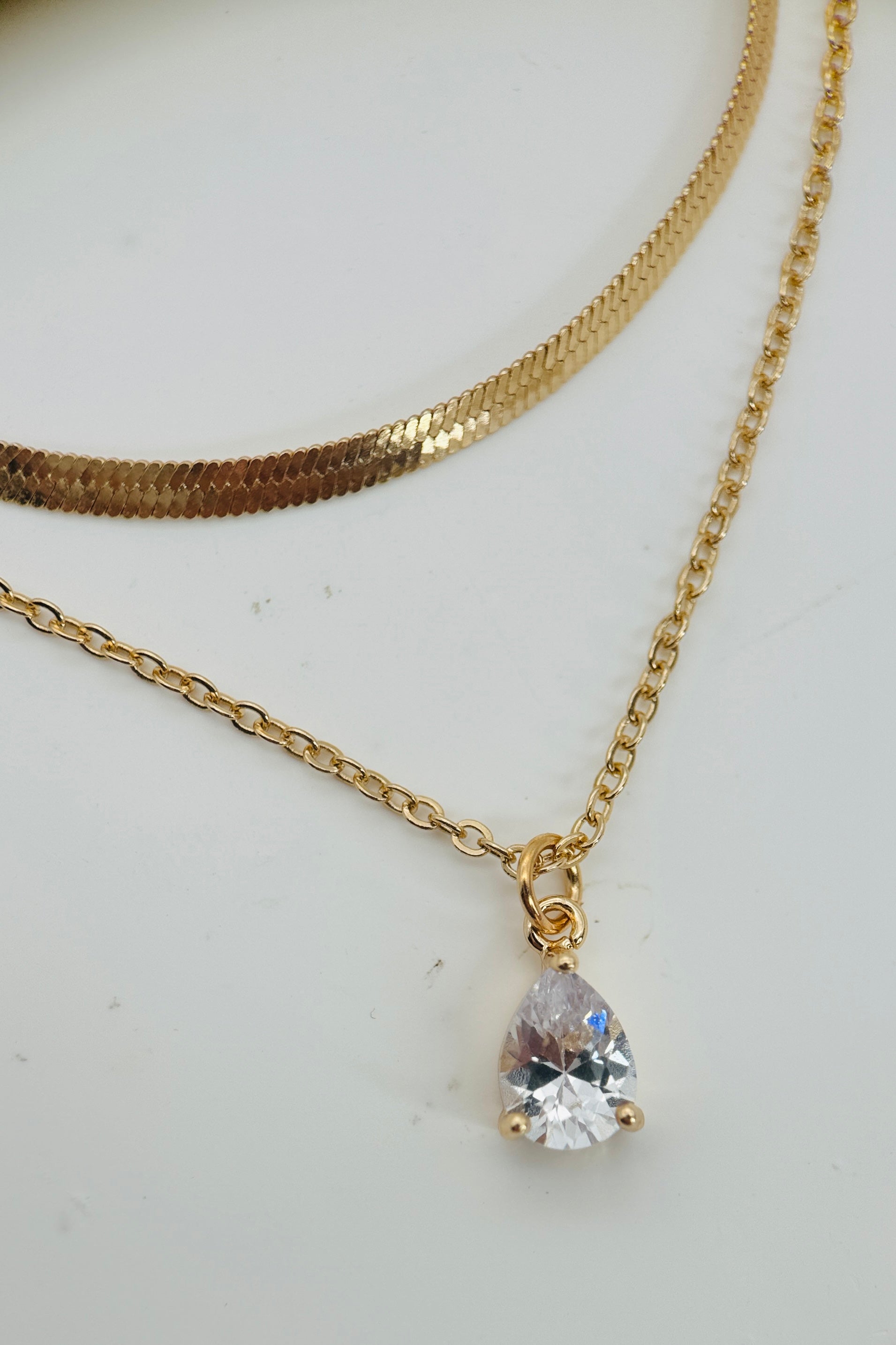 Double the charm with this necklace set featuring a herringbone choker and delicate snake chain with a stunning CZ teardrop pendant. Elevate any outfit with this unique duo.