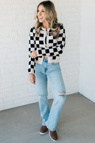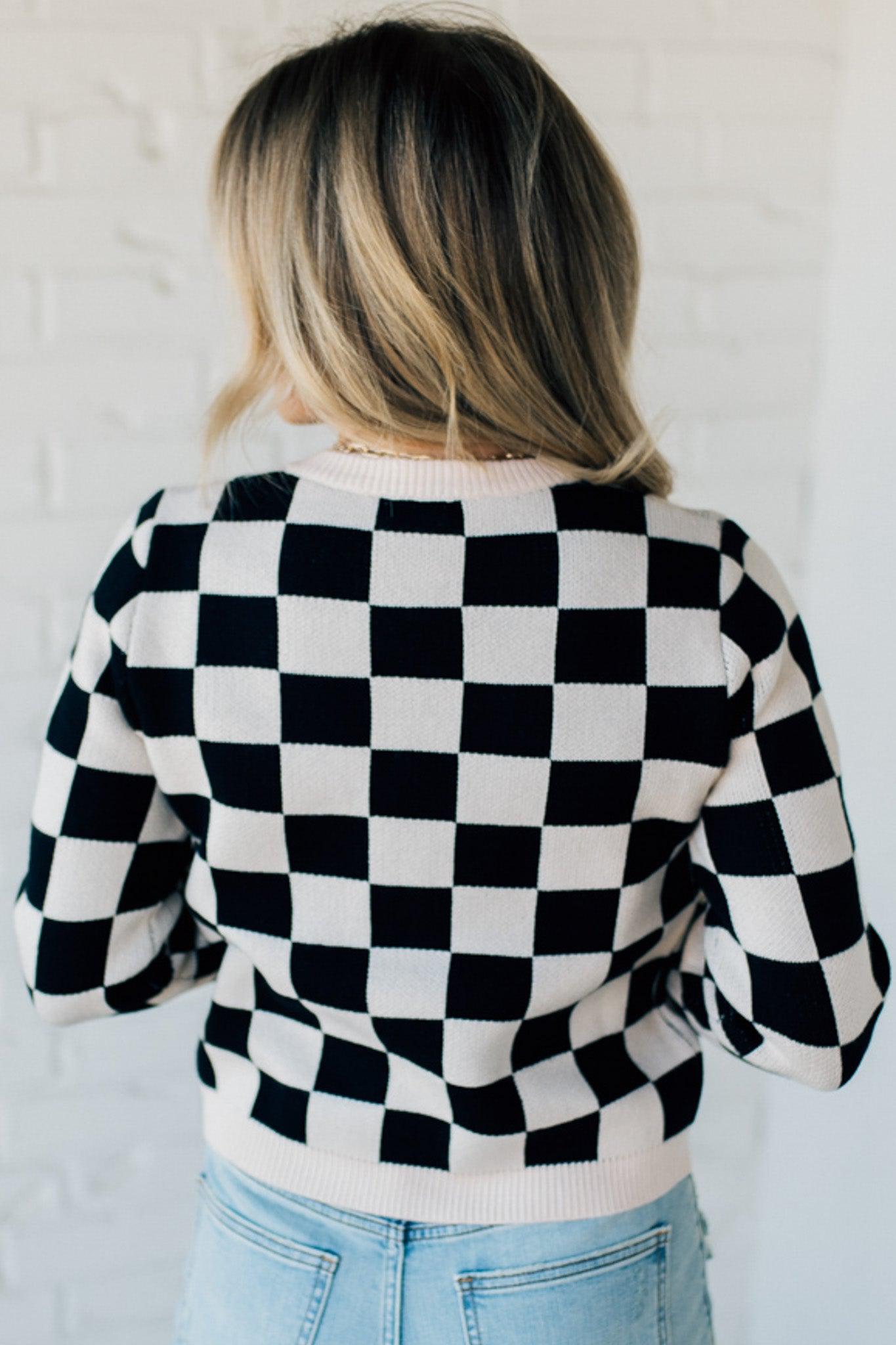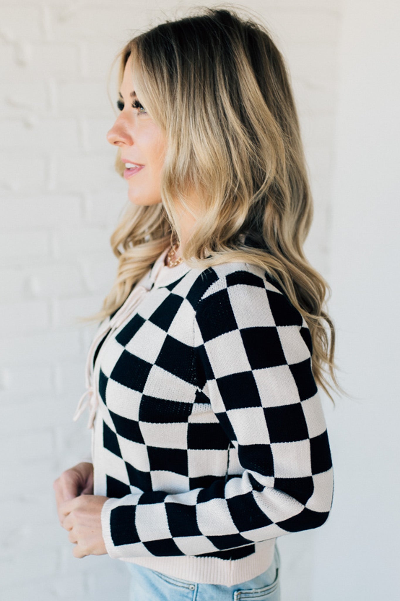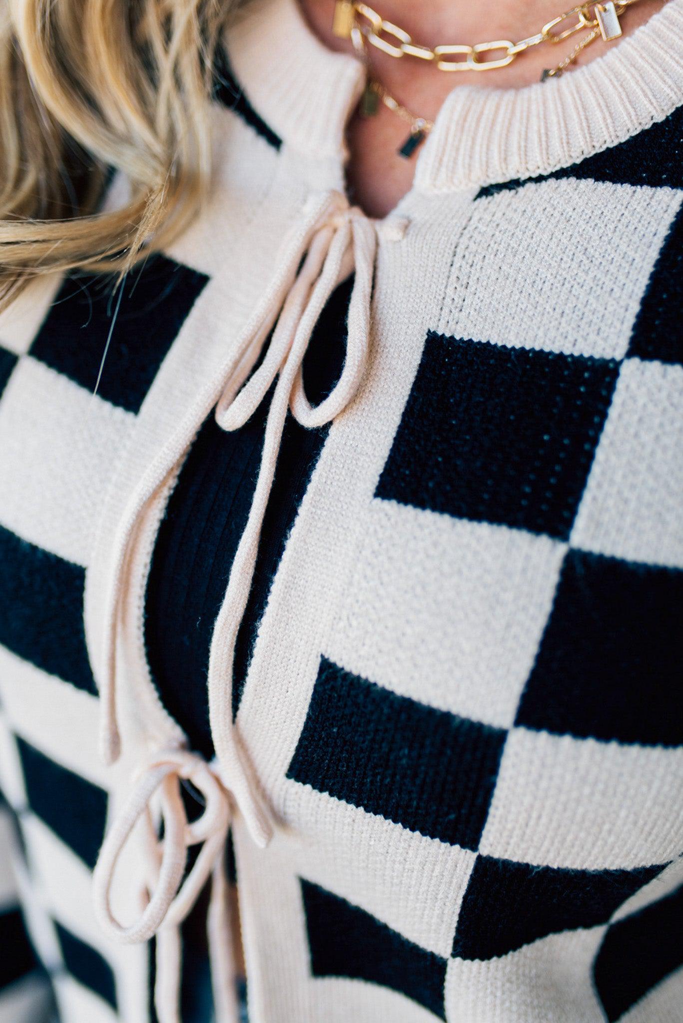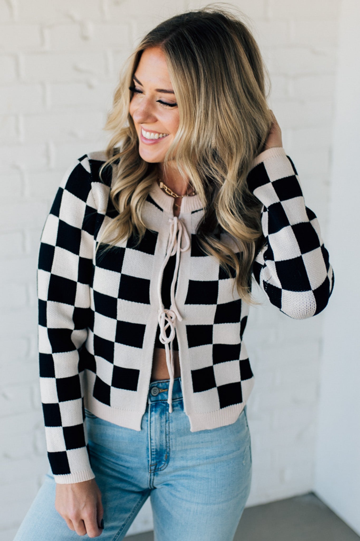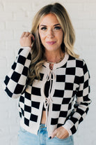 Get ready to check out this ultra-cool cardigan! Featuring a black and cream checker pattern and a high quality viscose blend, this sweater is sure to make a statement. The 2-tie front closure adds a playful twist to this classic round neck design. Stay stylish and cozy in this versatile must-have piece!