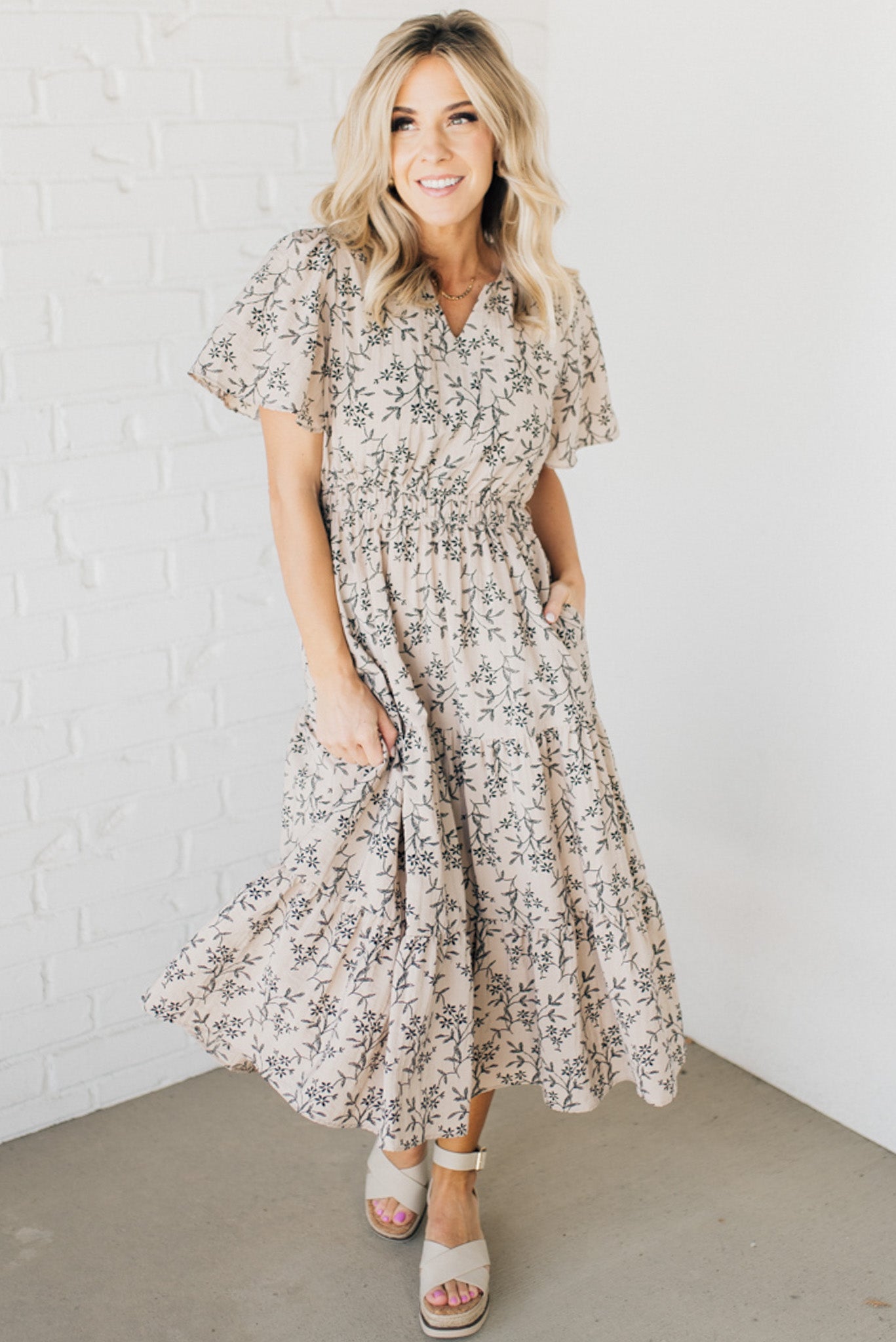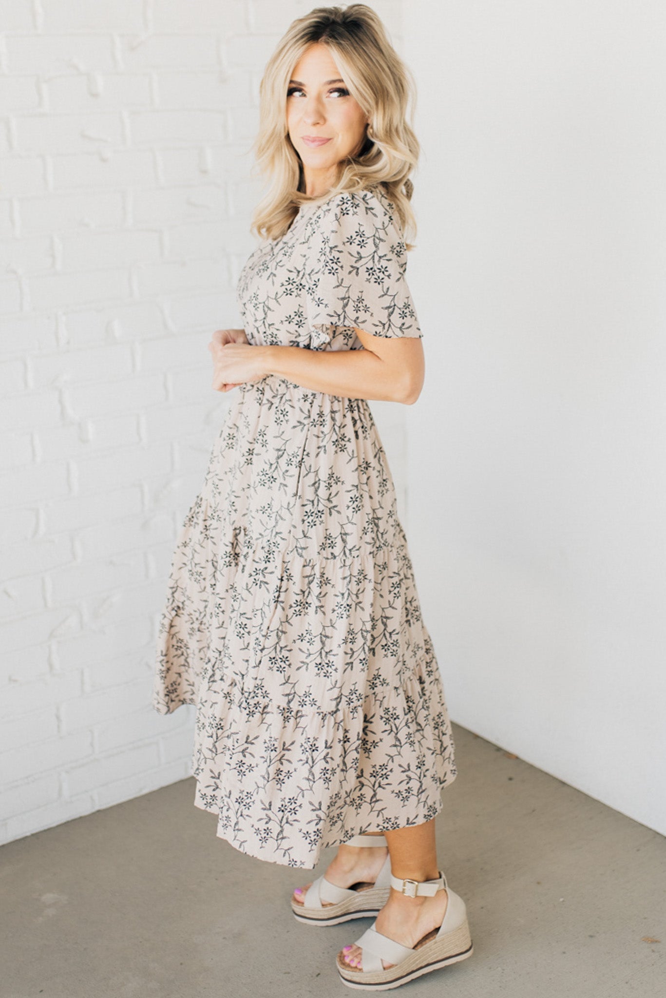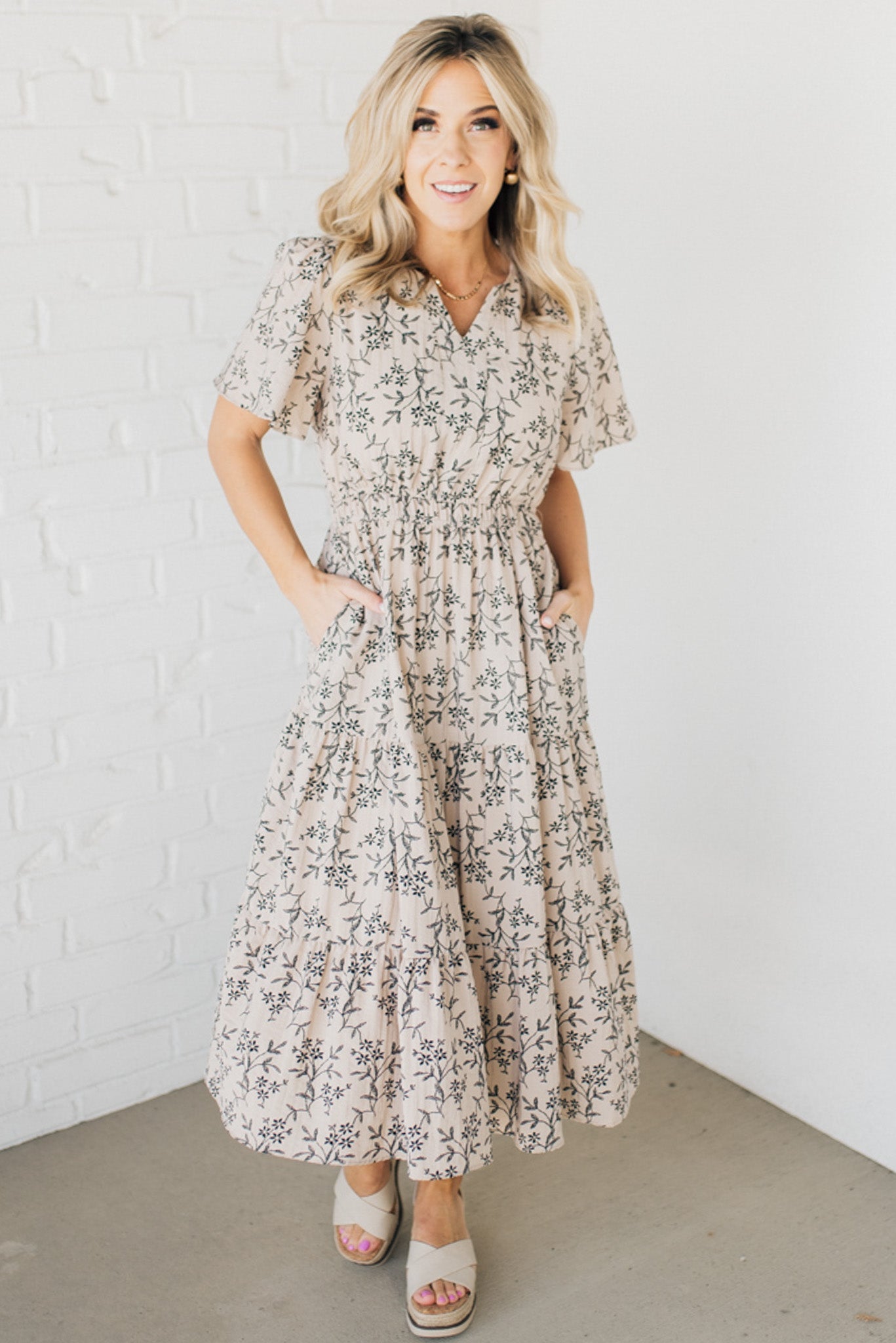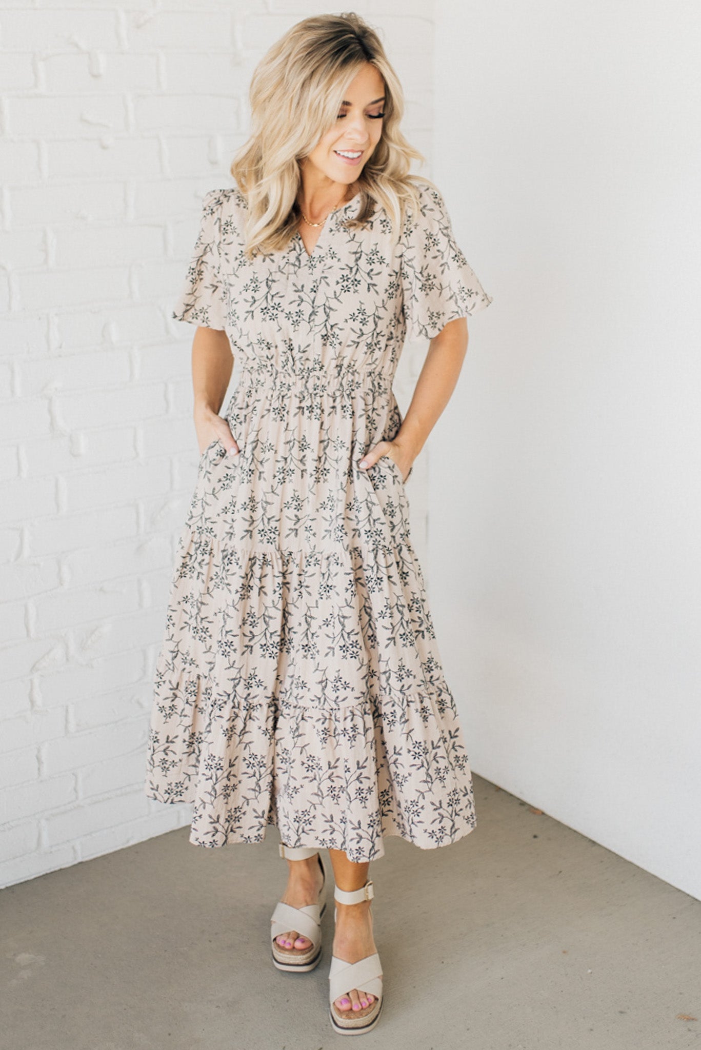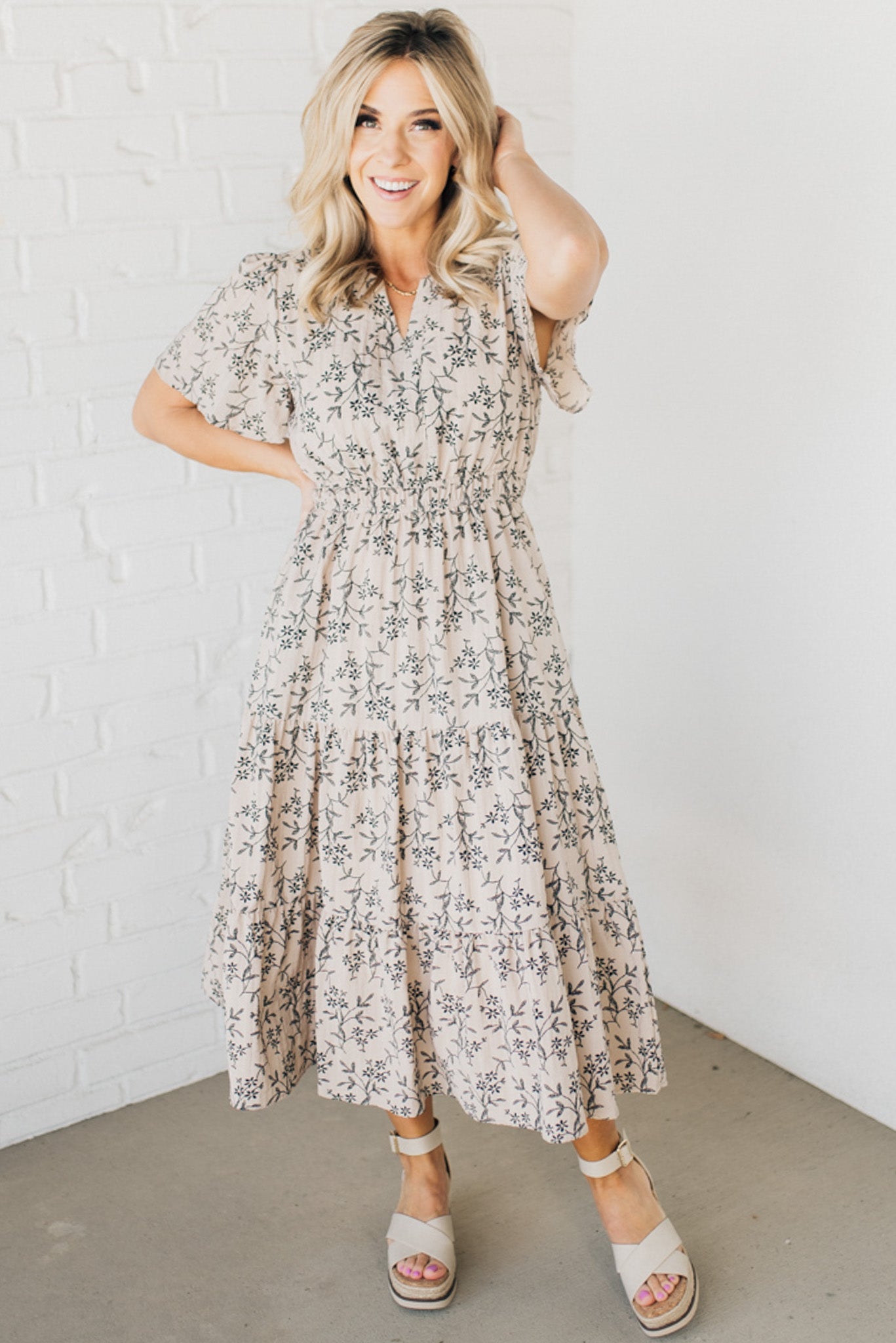 Get ready to bloom in style with our Maeve Printed Tiered Midi Dress! This womens dress features a stunning botanical print that will set you apart from the crowd. The cinch waist and tiered design add a playful touch to this elegant piece. Perfect for any occasion, this dress is both fashionable and functional.