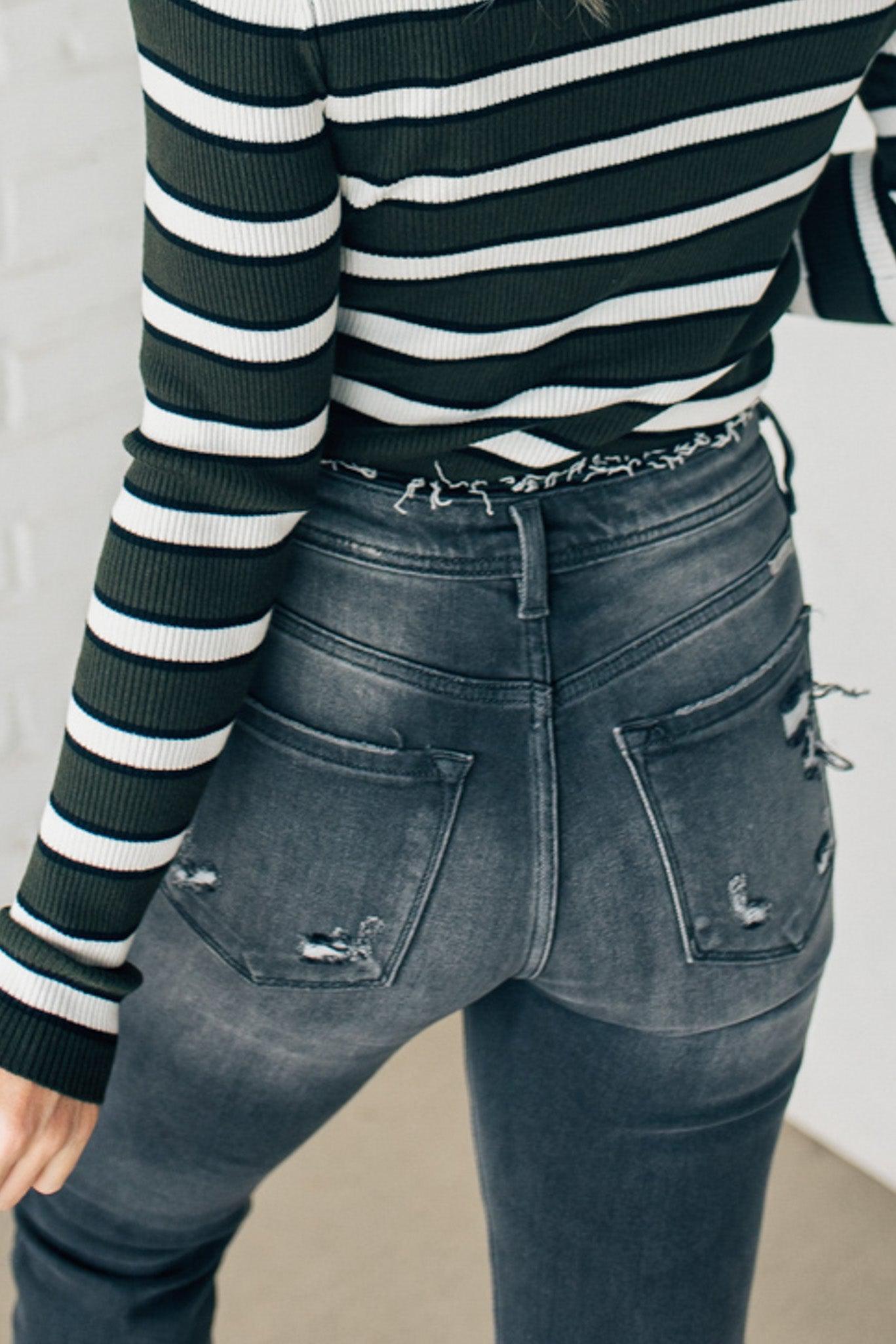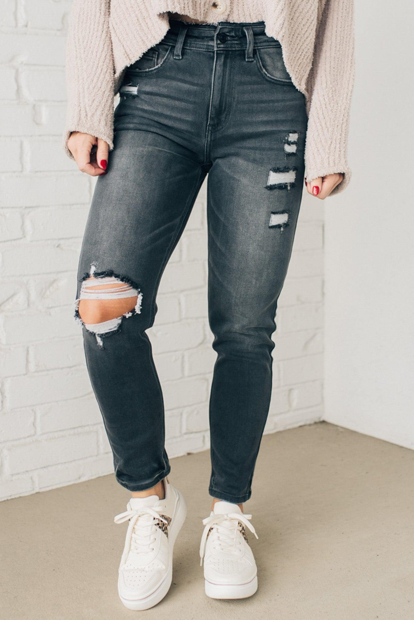 We love these distressed high rise fit mom jeans! With a wide ankle, and high rise waistline, you can pull these off any time of day, any style you choose!