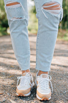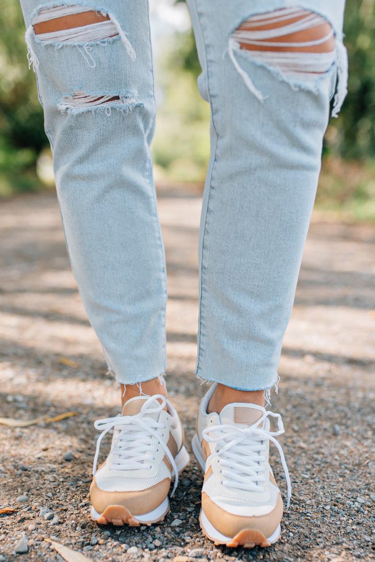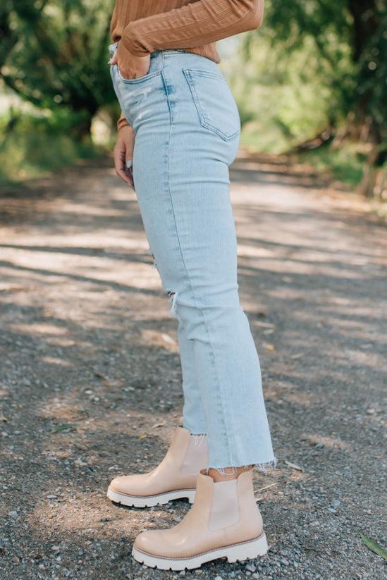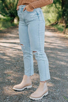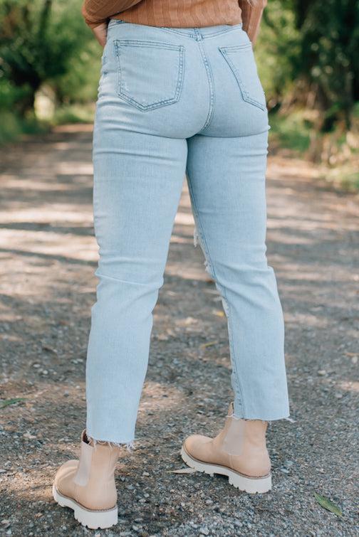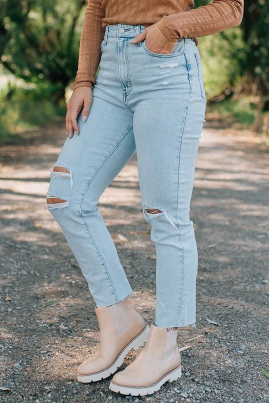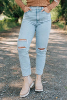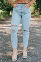 High rise, ripped girlfriend jeans, giving you the ultimate tummy control! The distressed knees, and super light wash are a perfect pair for a casual vibe! Structured waistline all the way around gives you a perfect fit!