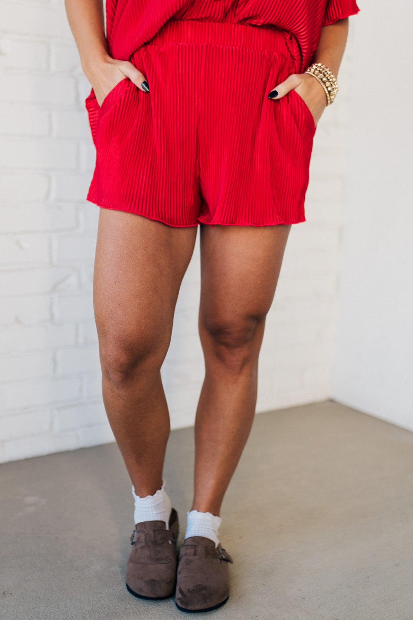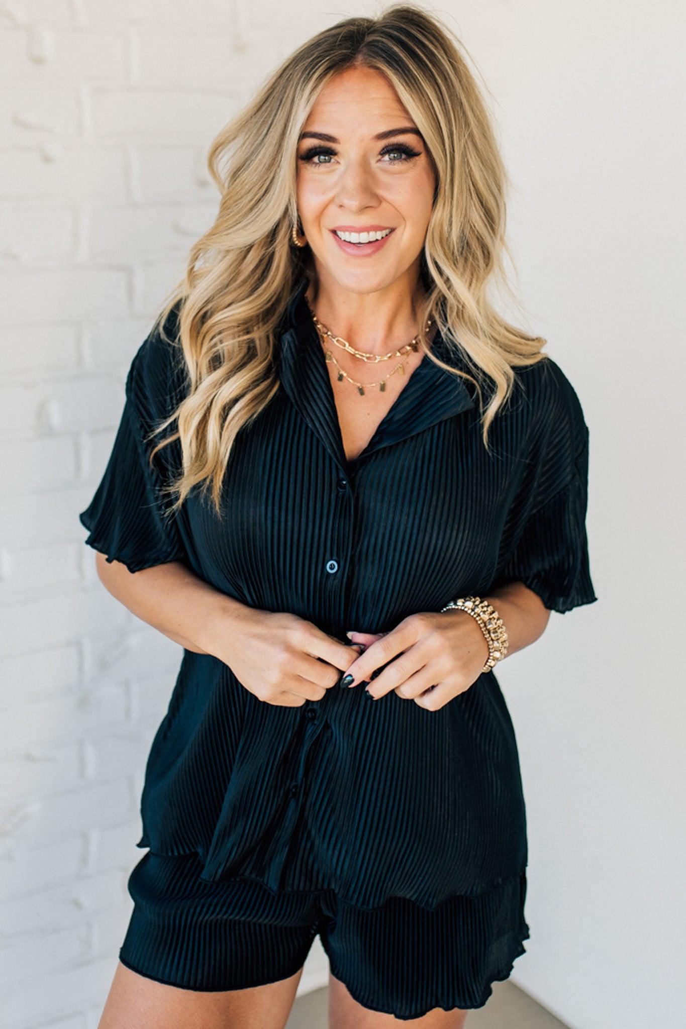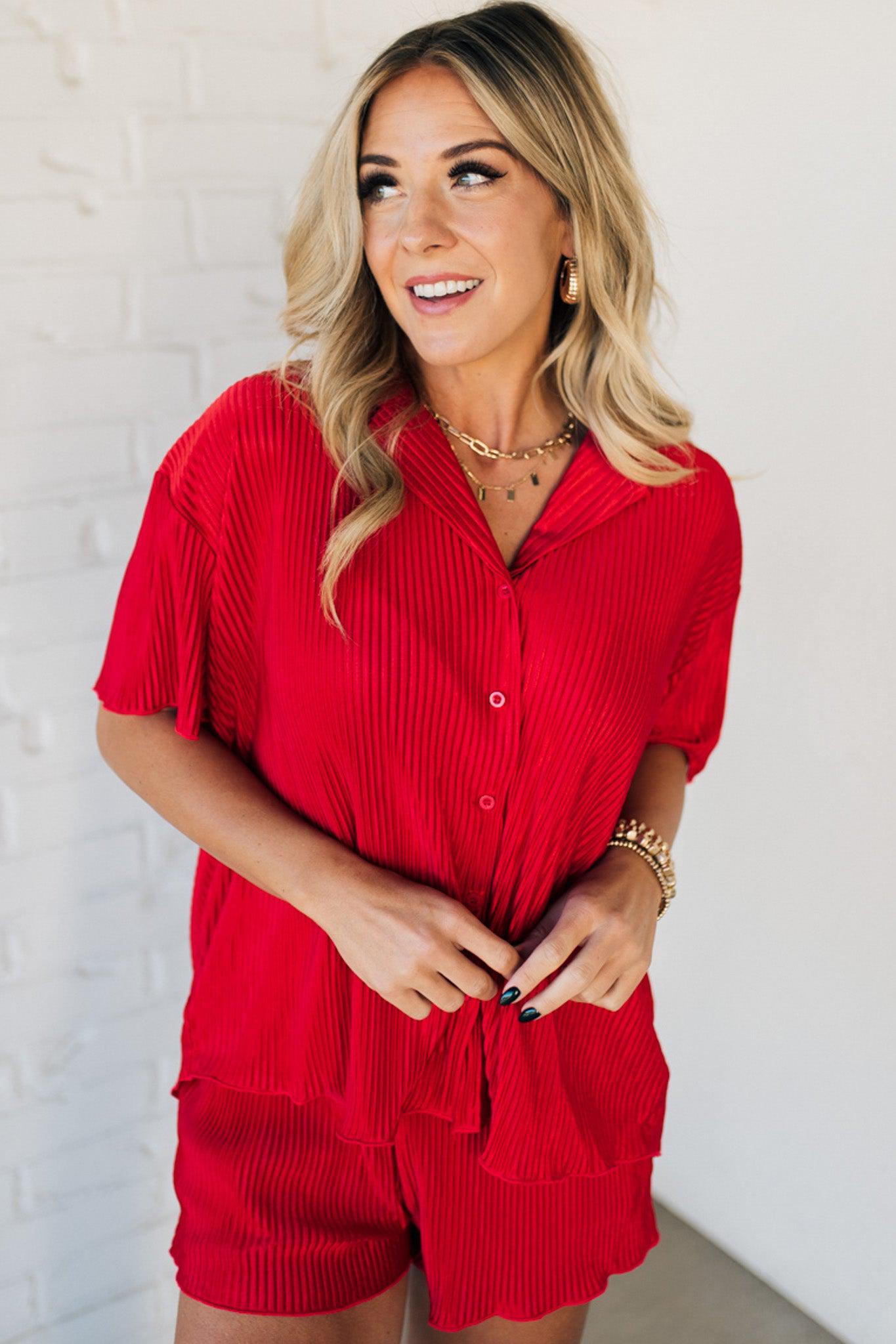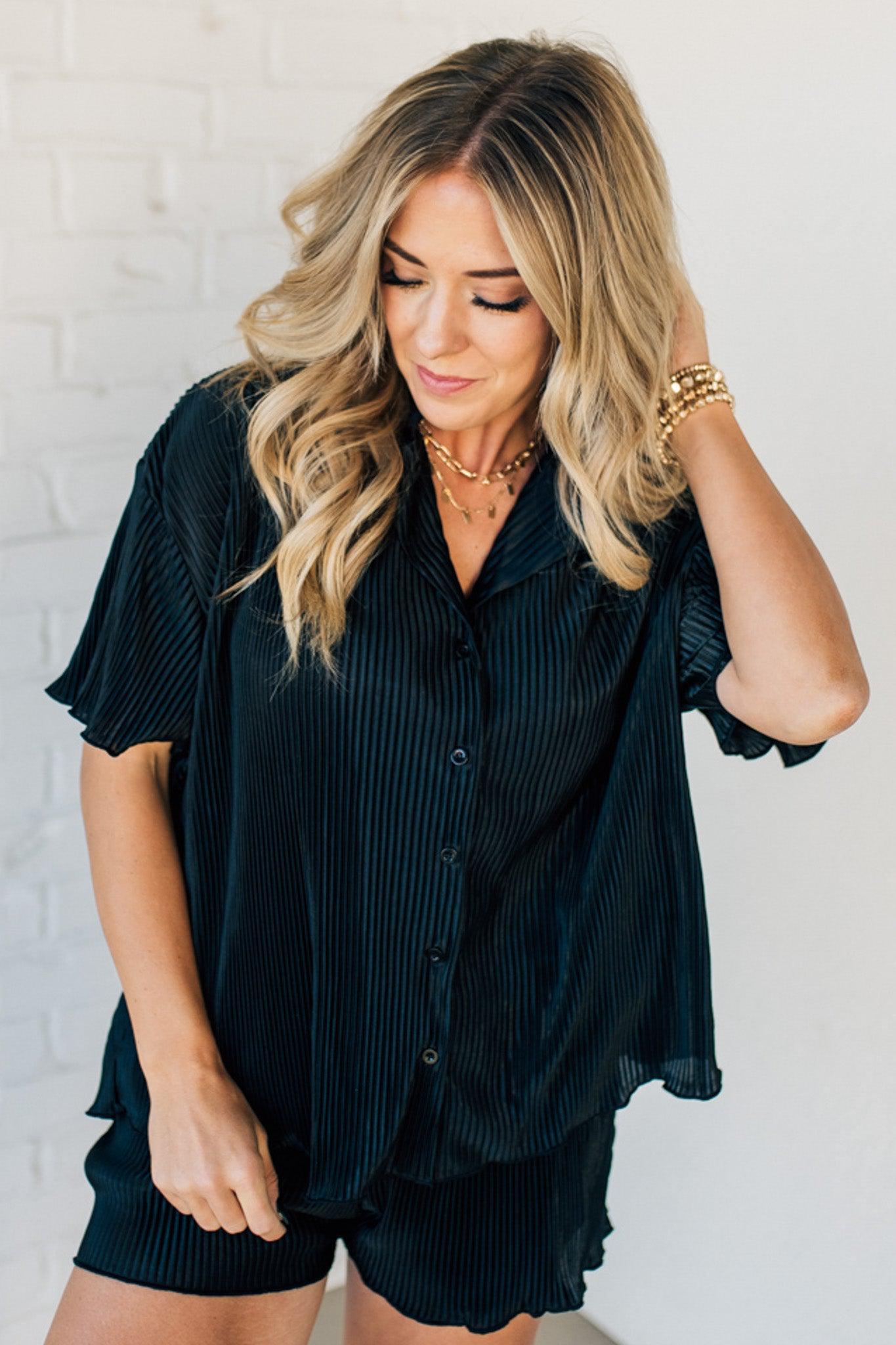 Slip into style and comfort with the Acey Pleated Short Set! This silk pajama set features accordion pleats and lettuce trim ruffle accents for a unique and playful look. The elastic band shorts and button front top with a flat lay collar add both convenience and charm. Don't sleep on this one! (Pun intended.)