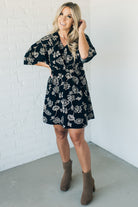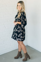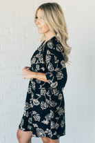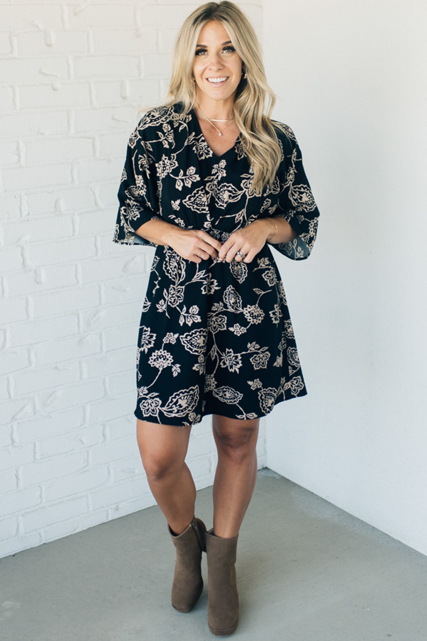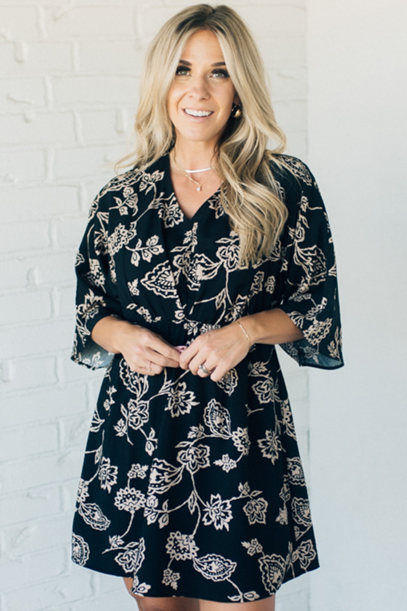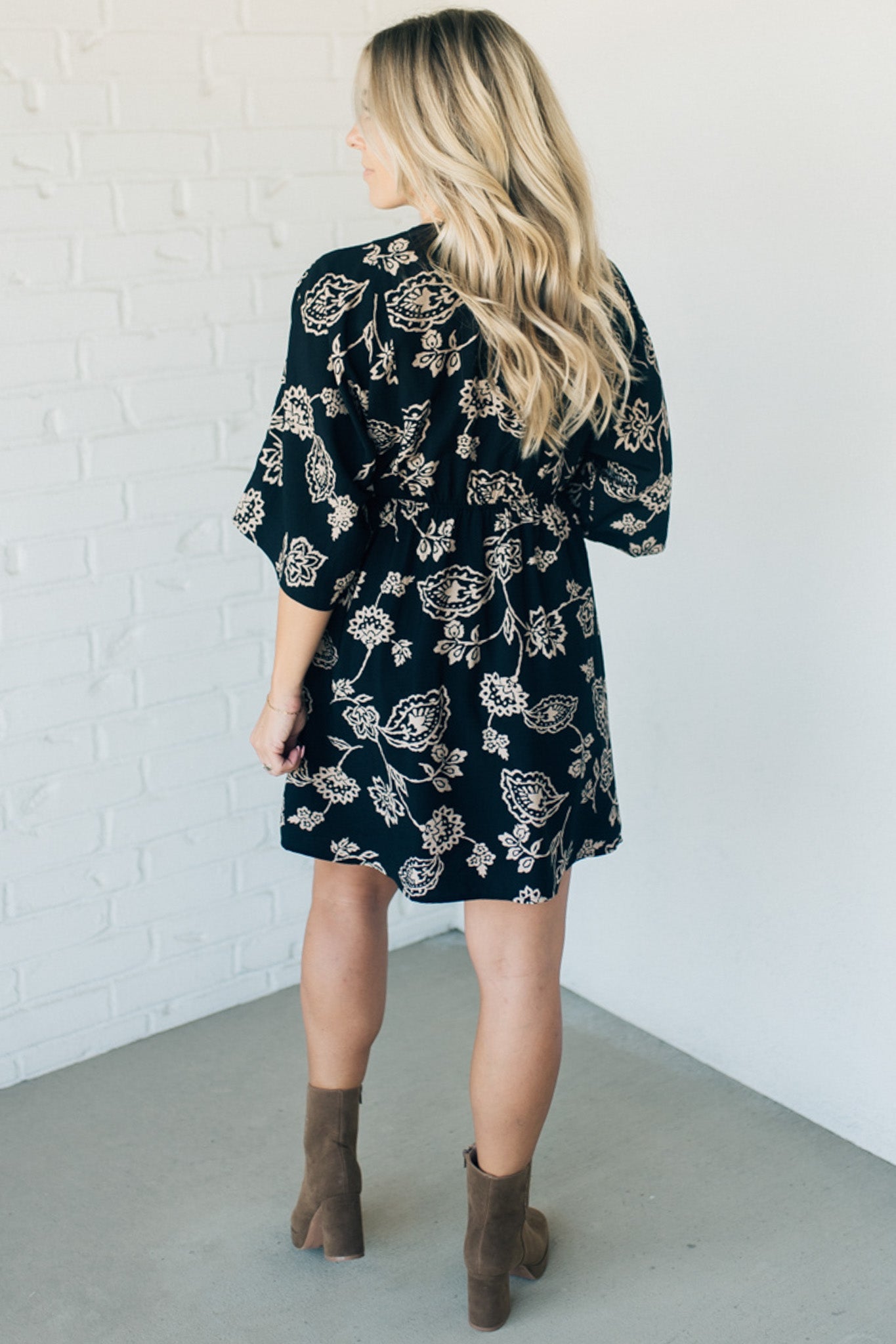 Flaunt your unique sense of style with our Kimono Sleeve Printed Mini Dress. The V-neck and elastic waist offer a flattering fit, while the knee-length and A-line cut add a touch of elegance. The black dress with taupe floral print is perfect for any occasion. Stand out from the crowd with this playful and stylish piece!