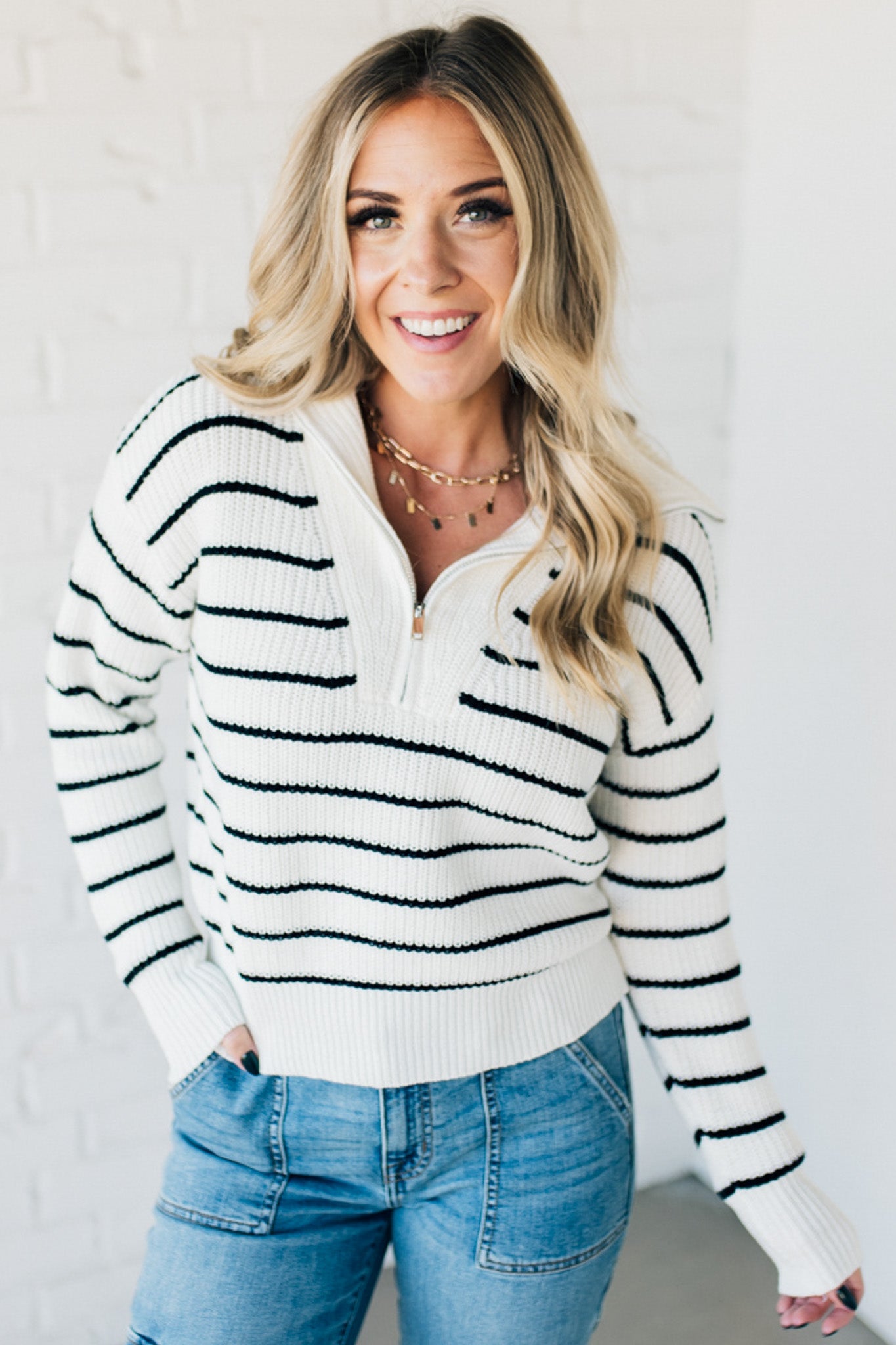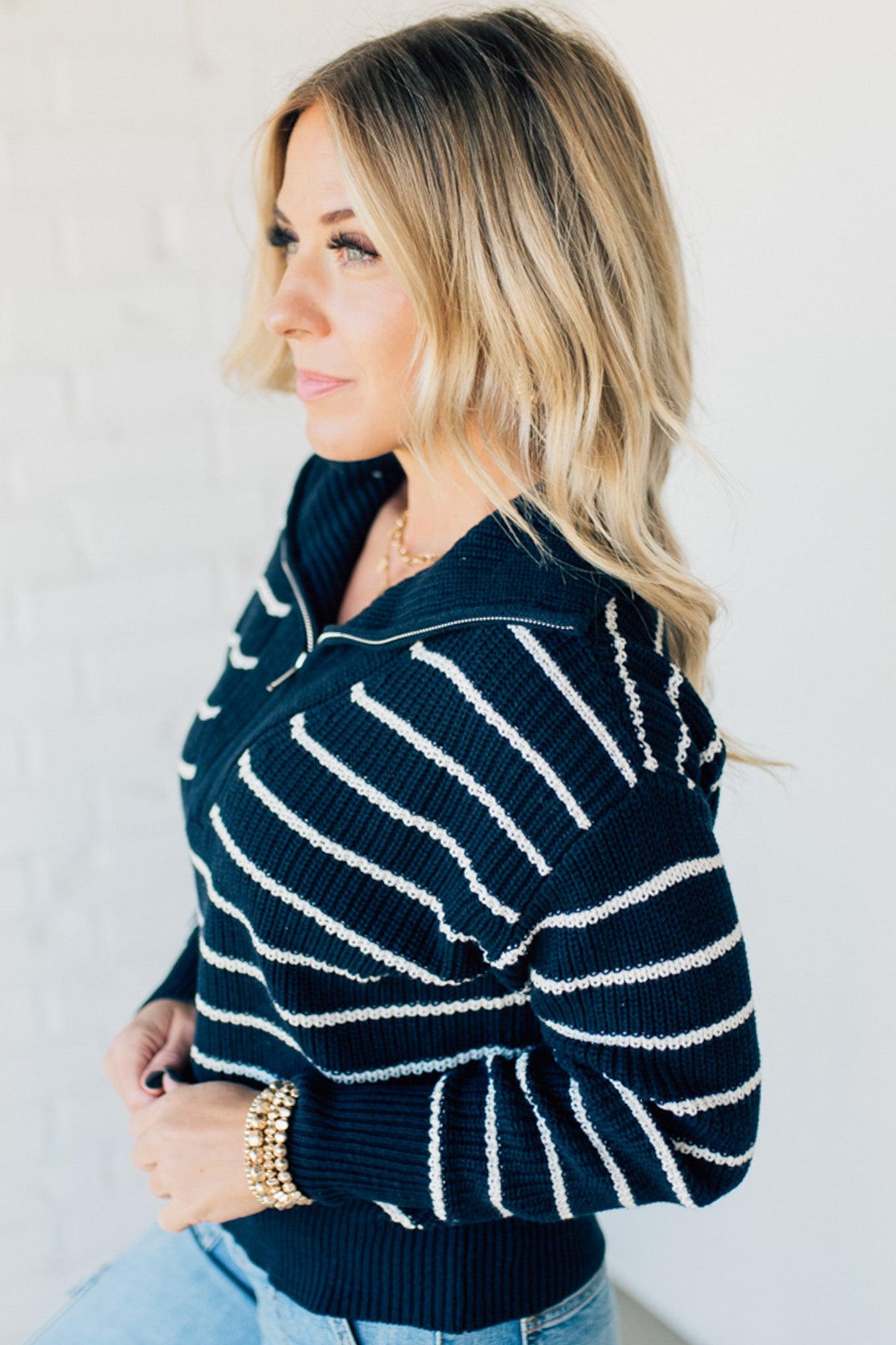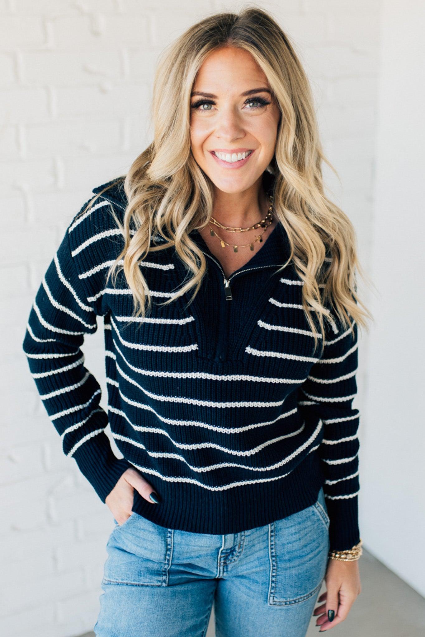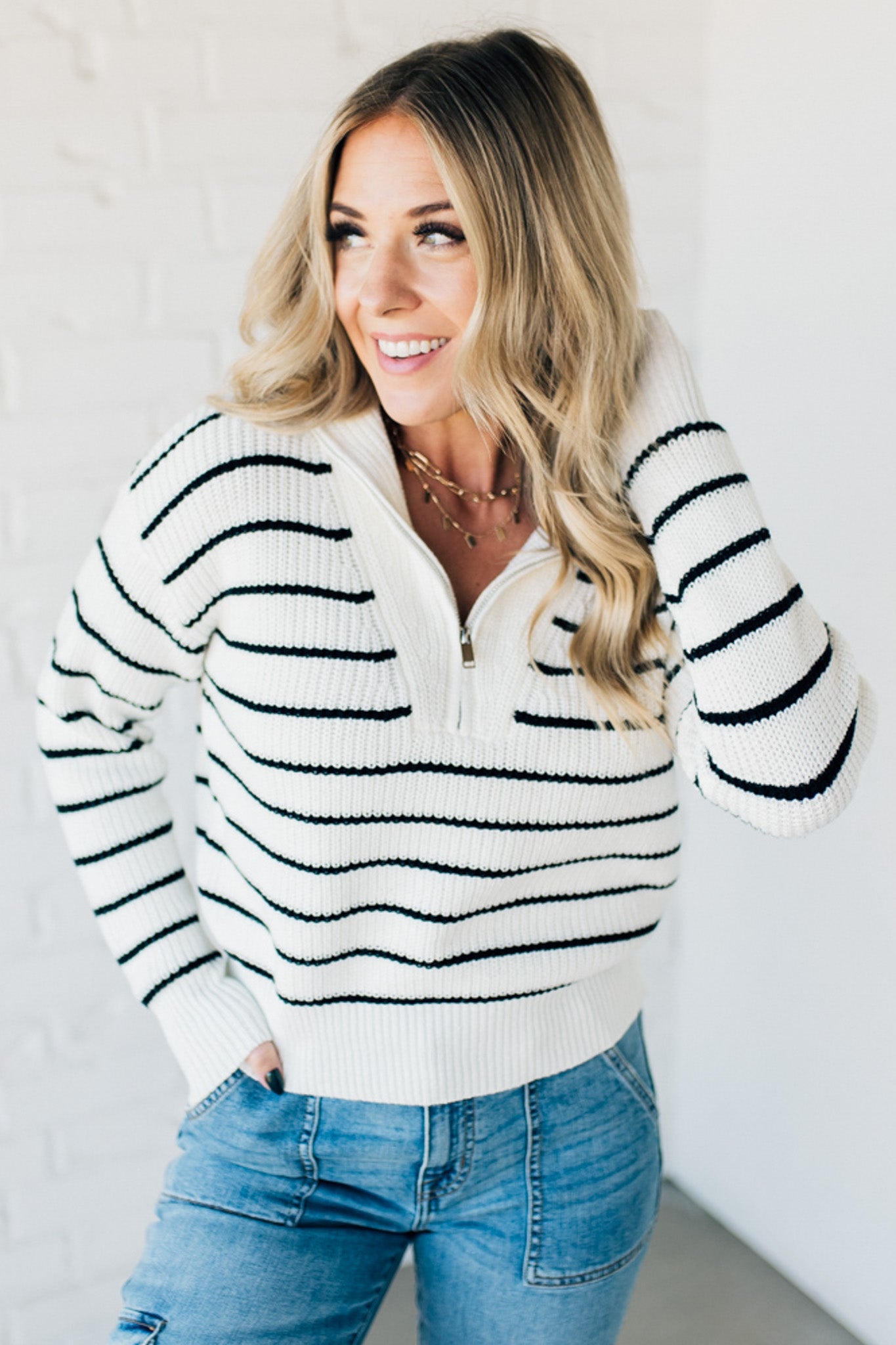 Get ready to strut your style with our Mary Striped Zip Henley Sweater! Featuring a flat lay collar and fine horizontal stripe weave, this sweater is both stylish and comfortable. The silver zipper henley adds a touch of edginess, while the tapered waist and drop shoulder create a flattering silhouette. Perfect for a playful and quirky look!