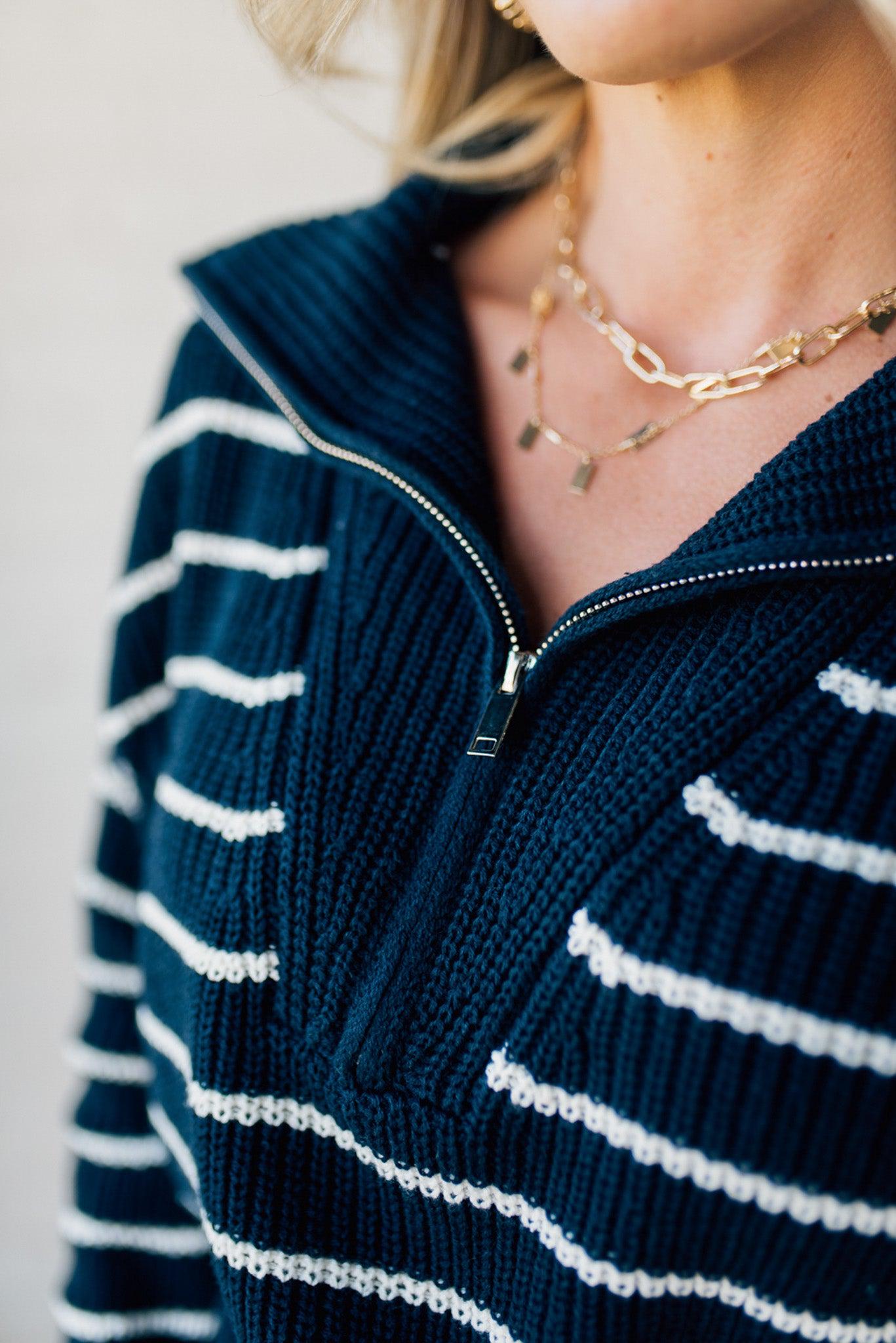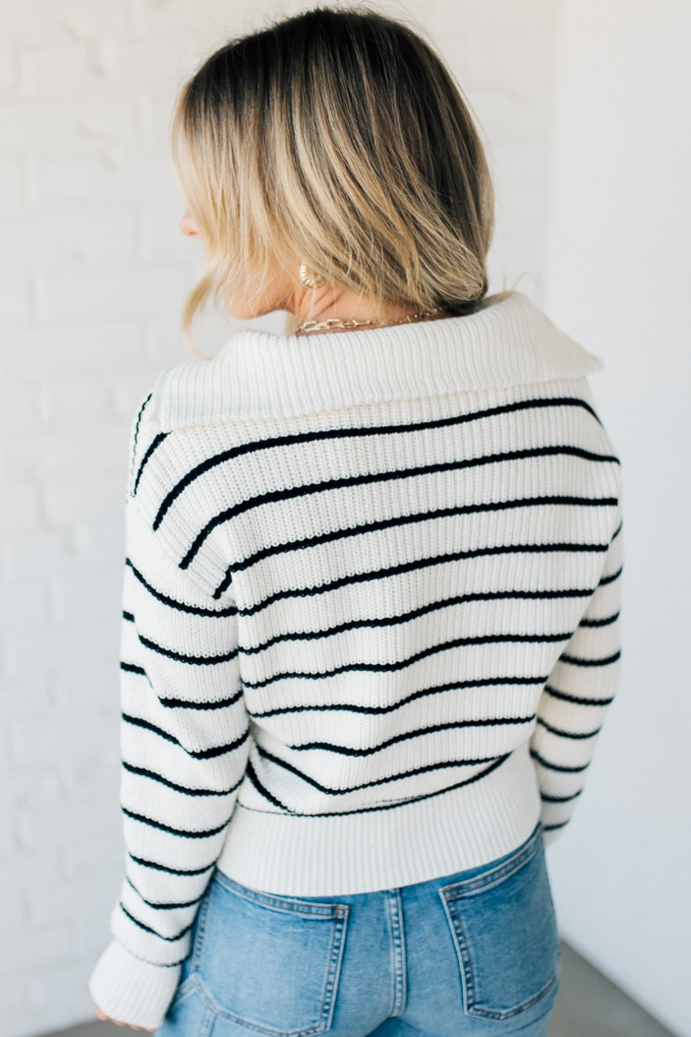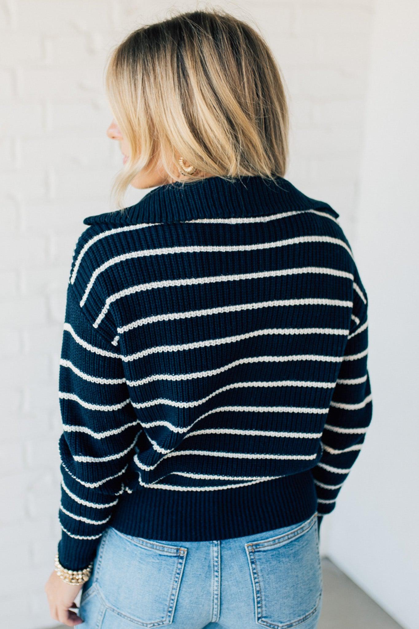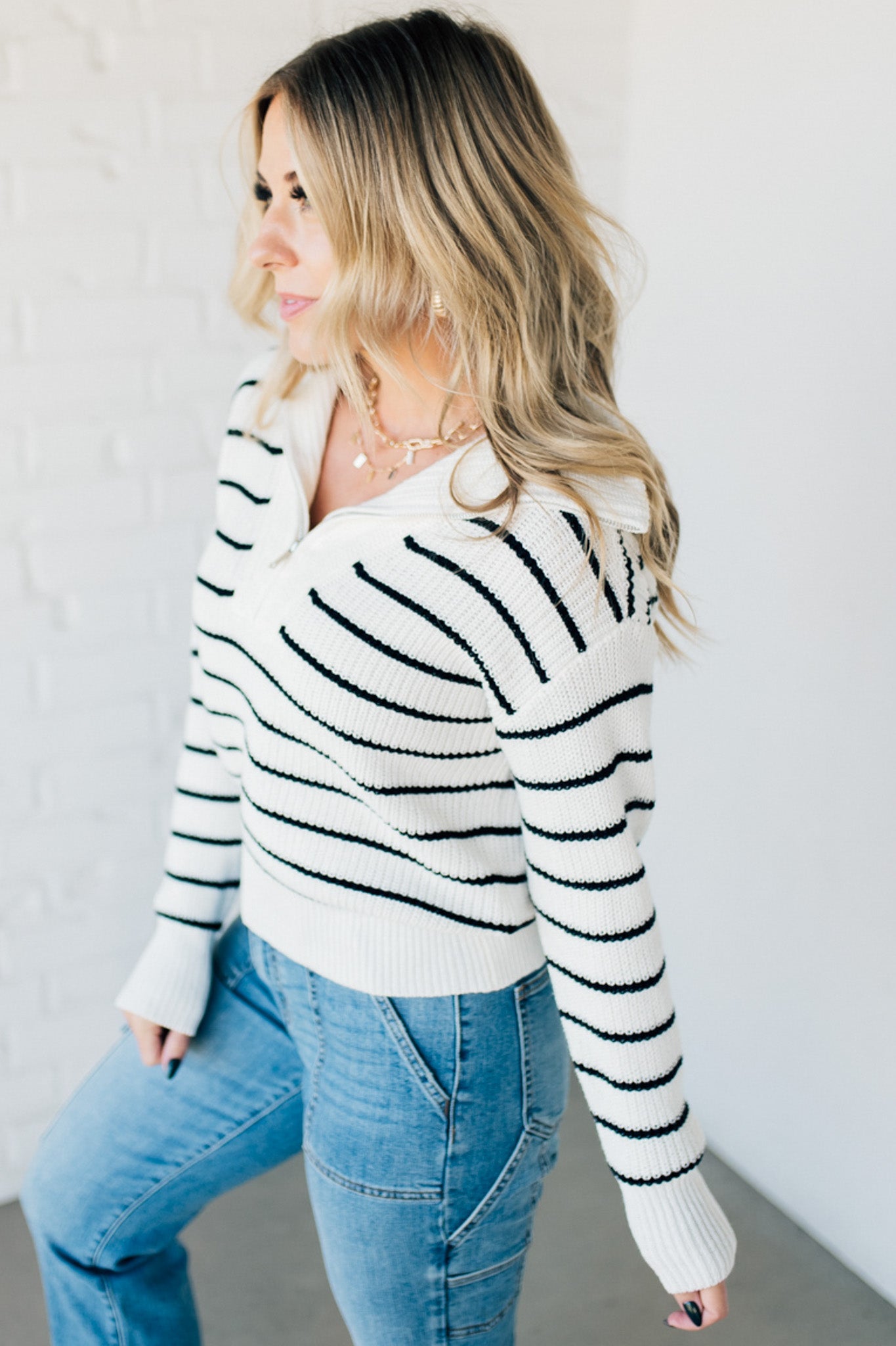 Get ready to strut your style with our Mary Striped Zip Henley Sweater! Featuring a flat lay collar and fine horizontal stripe weave, this sweater is both stylish and comfortable. The silver zipper henley adds a touch of edginess, while the tapered waist and drop shoulder create a flattering silhouette. Perfect for a playful and quirky look!