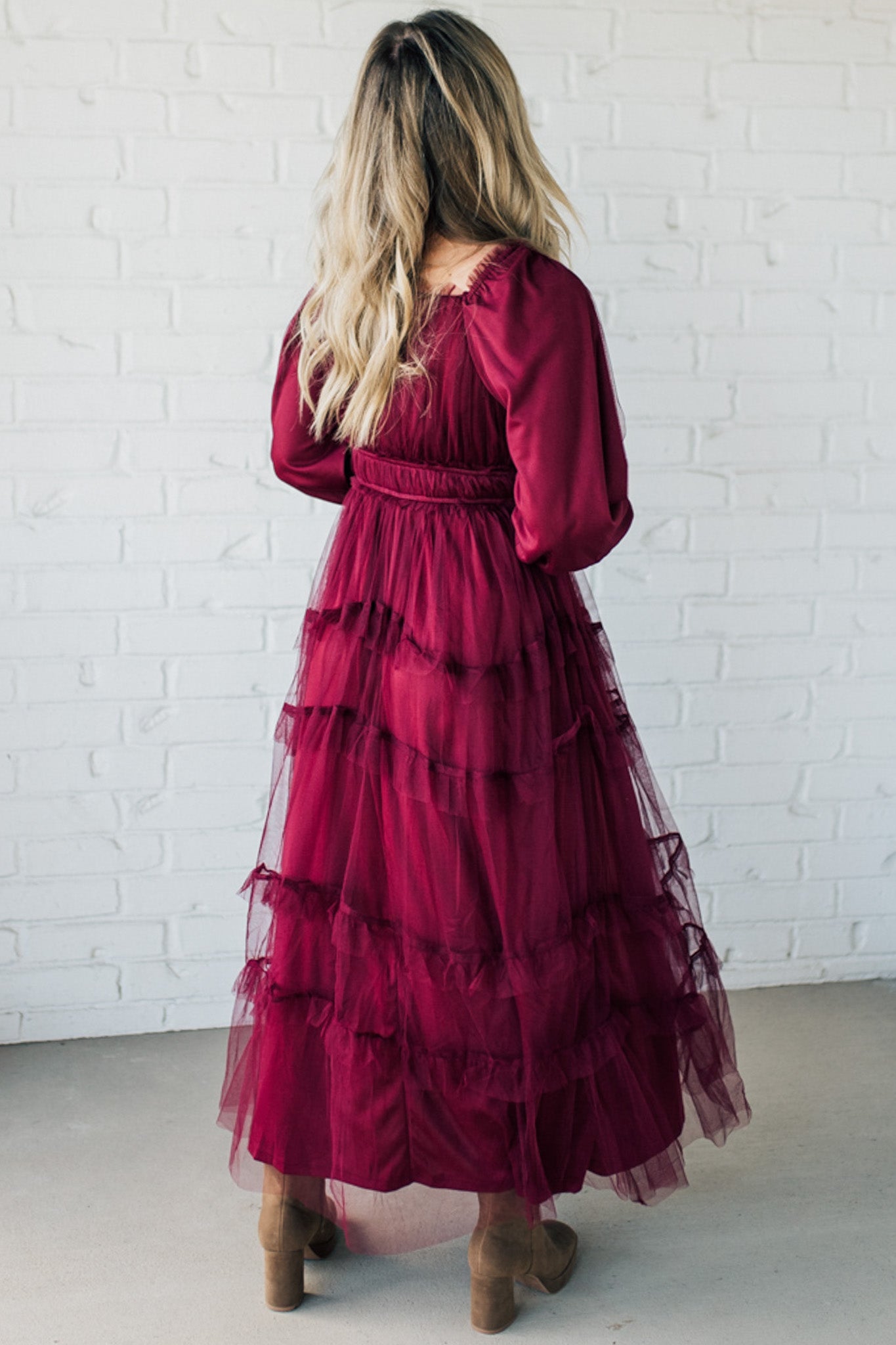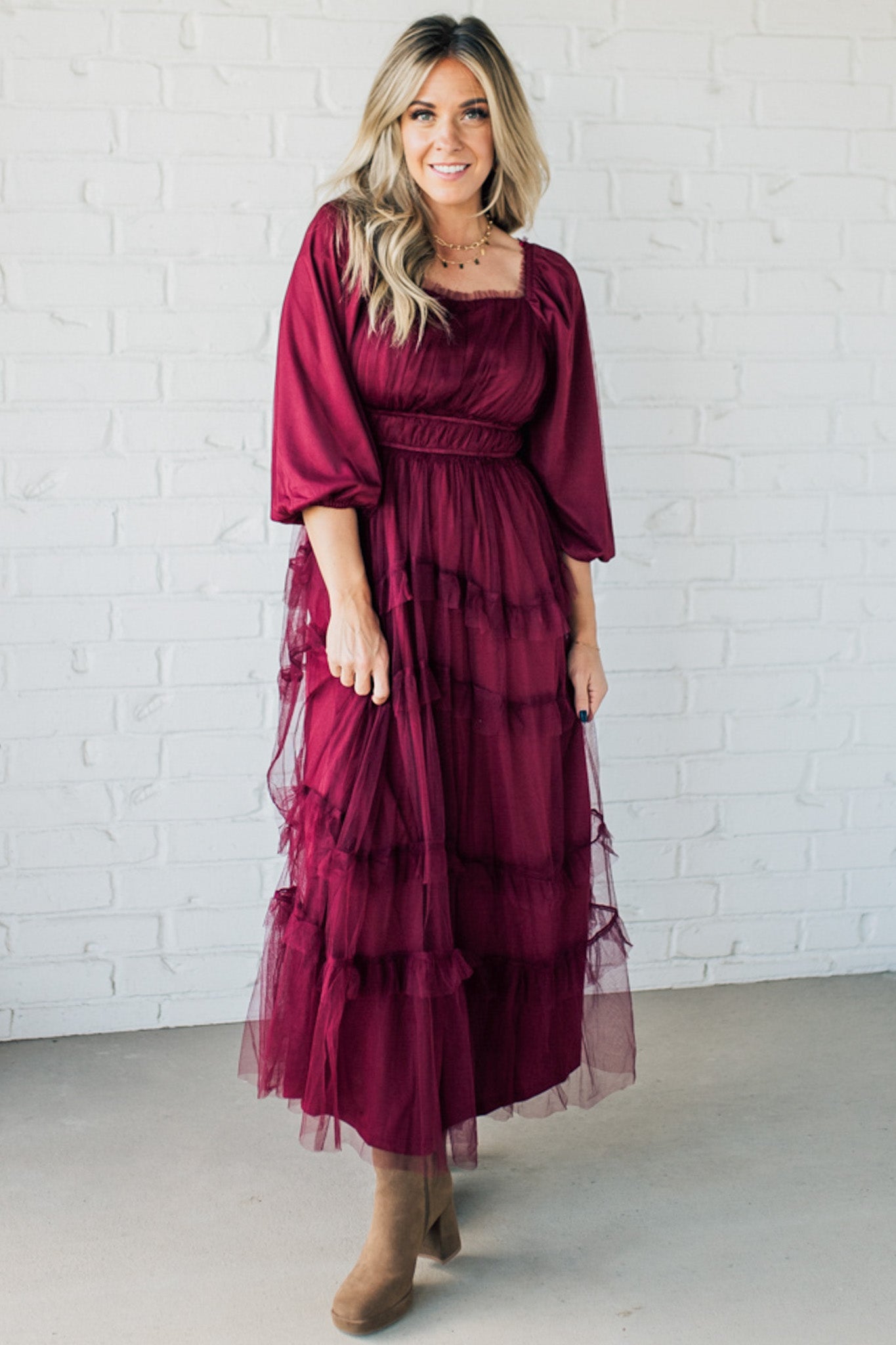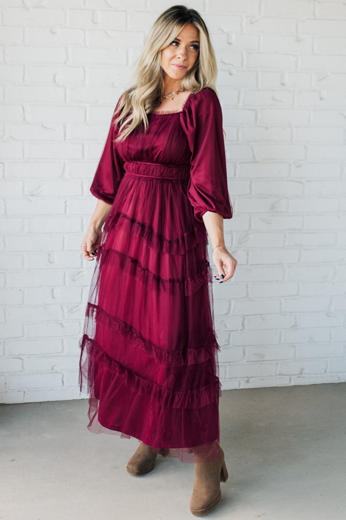 Be the belle of any ball in the Tessa Tulle Tiered Dress. With its sheer ruffle tiered tulle and long sleeves, this maxi dress pairs beautifully with a square neckline for a stunning and elegant look. Perfect for any special occasion. (Or just feeling extra fancy on a normal day.)