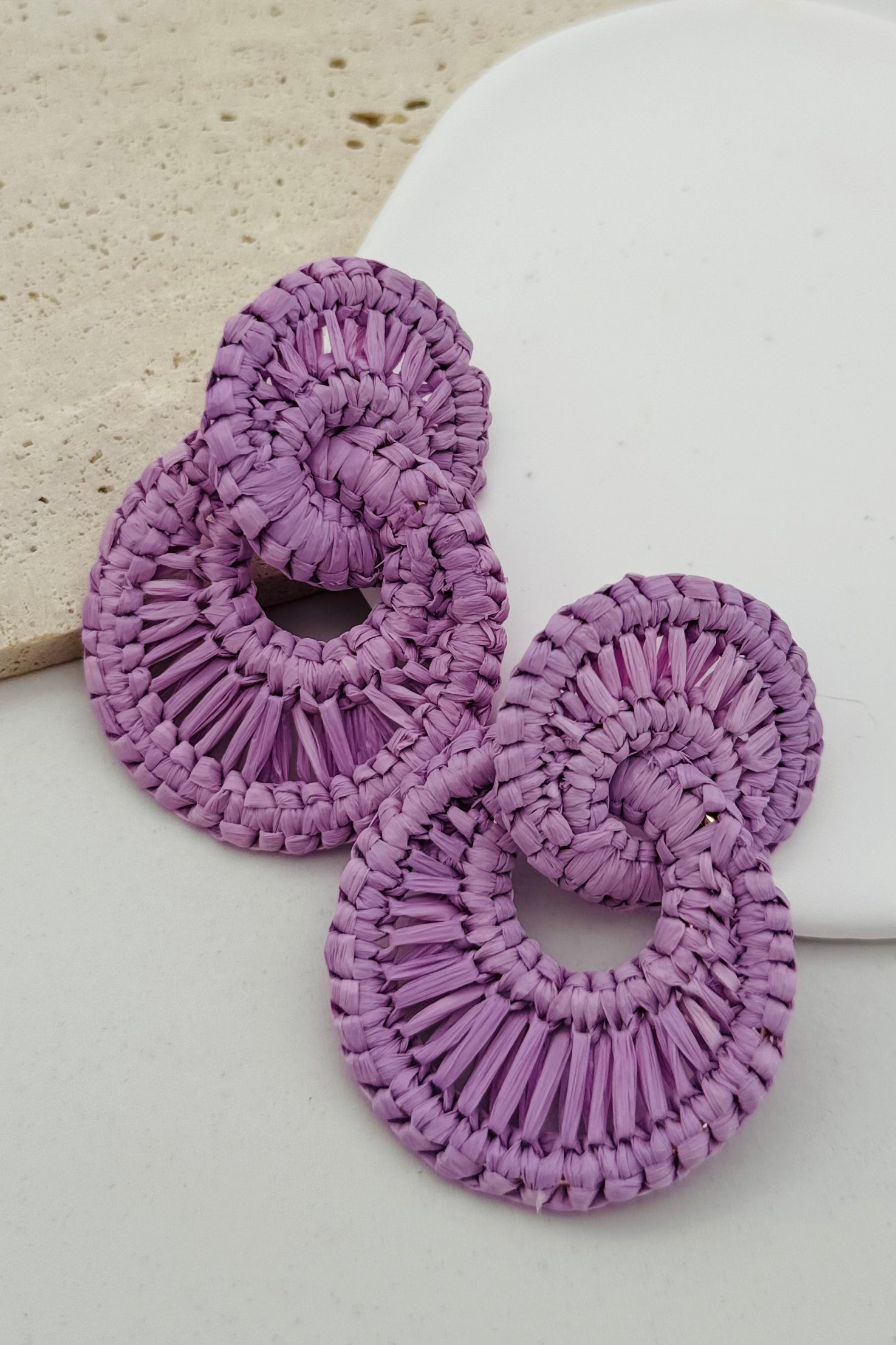 These unique earrings feature double hoops made from woven raffia straw, creating a playful and statement-making look. Perfect for adding a touch of quirkiness to any outfit, these earrings are sure to turn heads and showcase your personality!