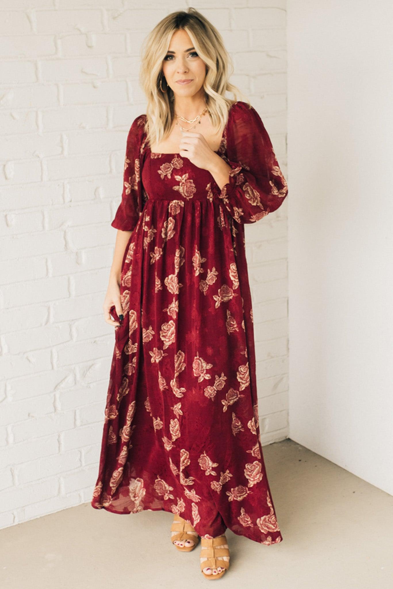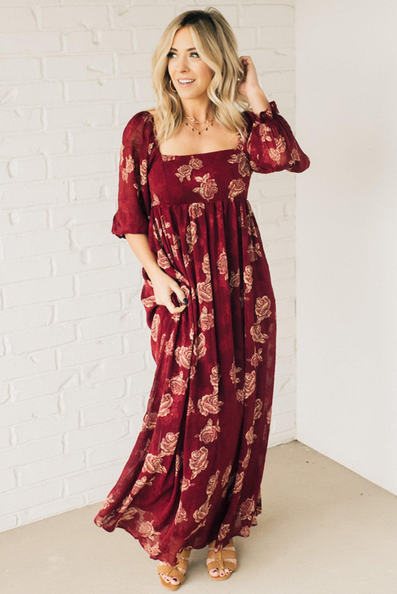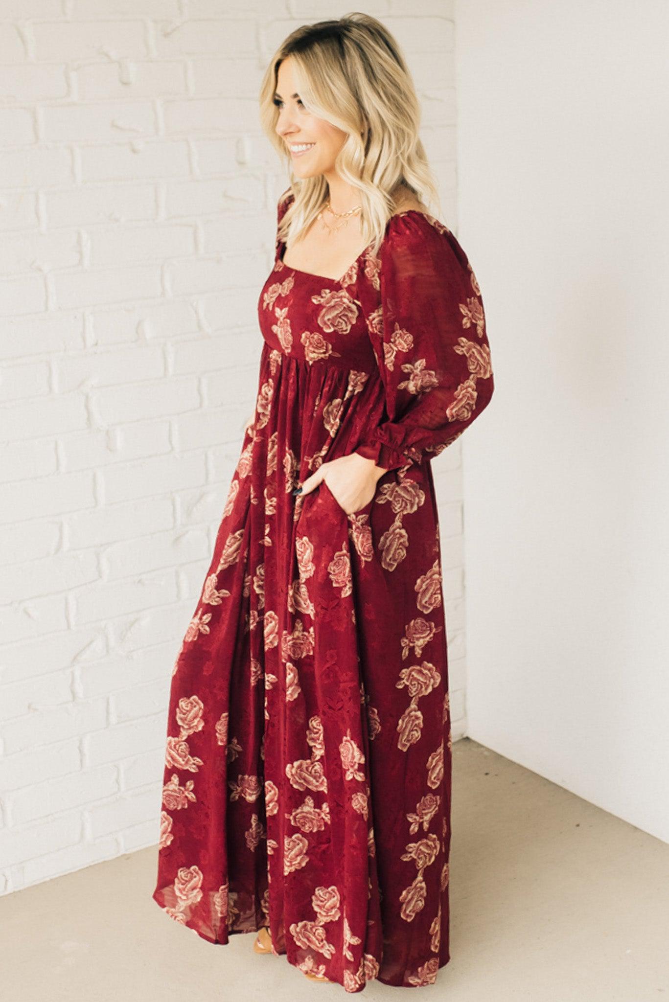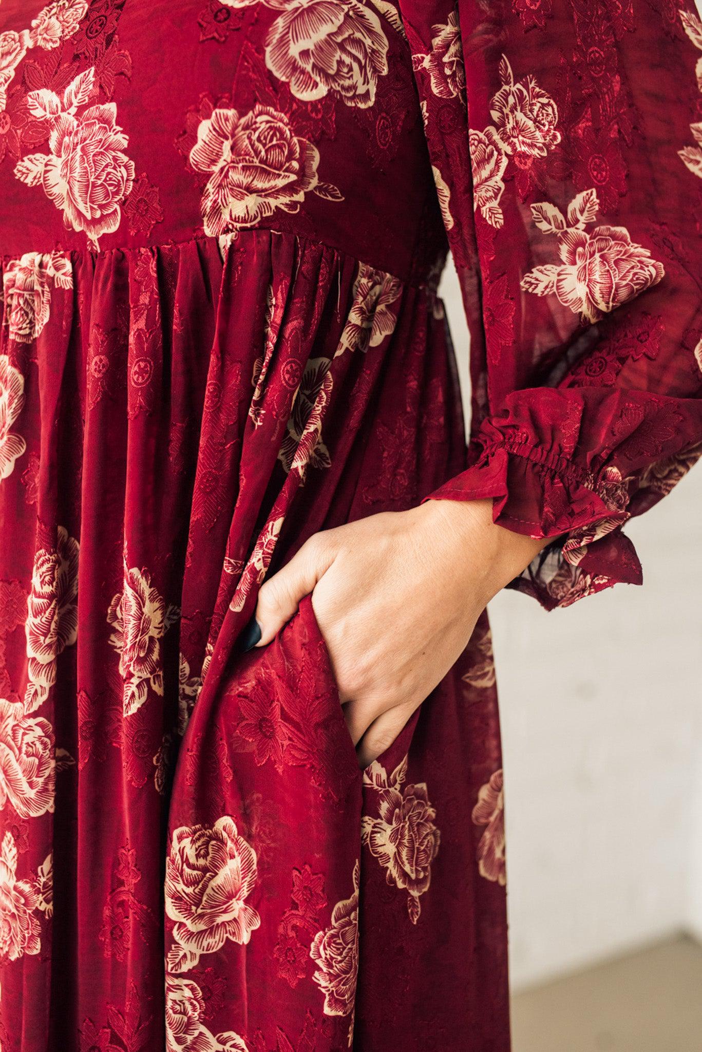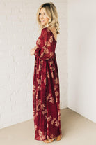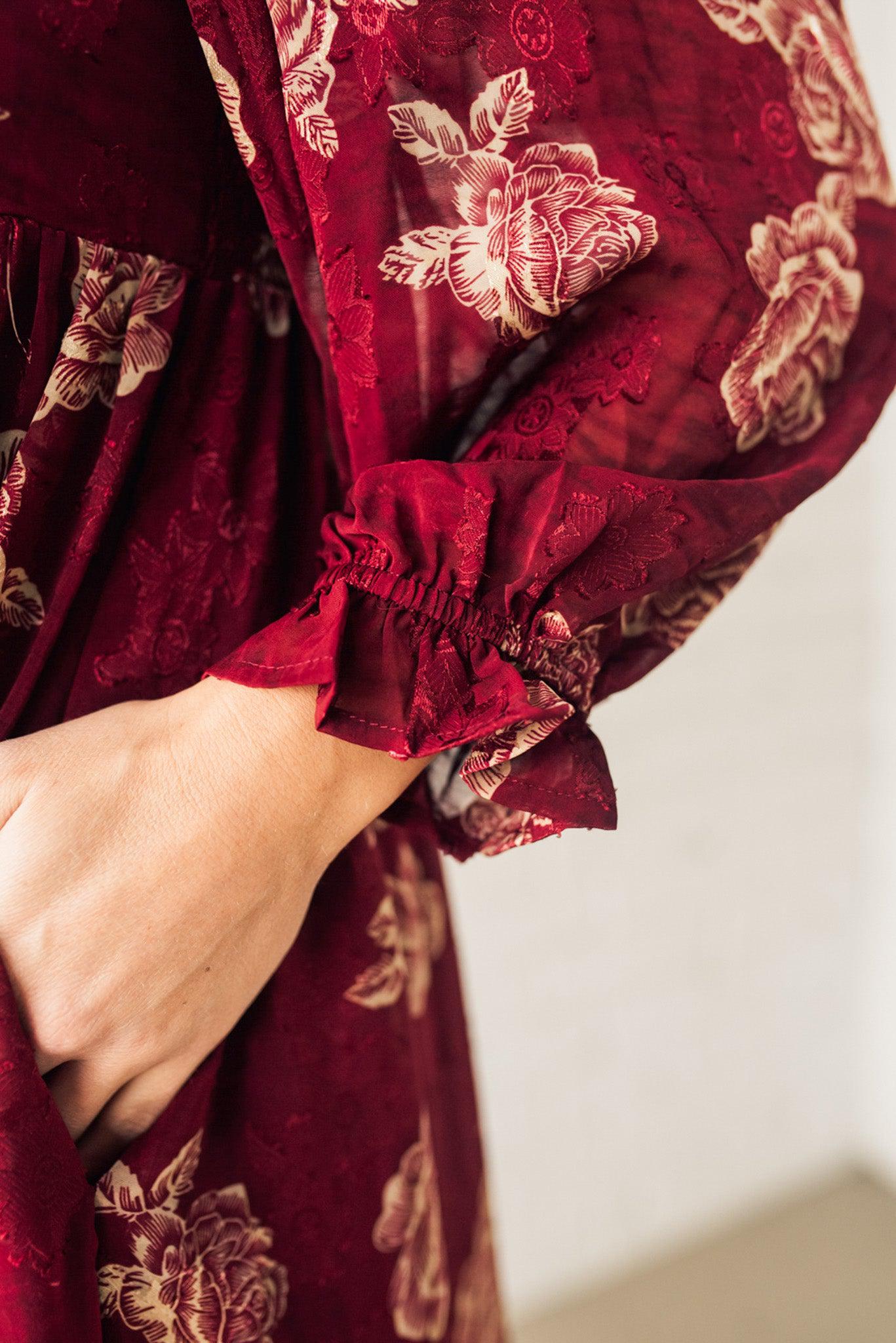 Look stunning and show off your style with this Rumi Floral Maxi Dress. Boasting a crushed sheer floral print fabric, bishop sleeve, and off shoulder option, this maxi dress is sure to make a statement. With its side pockets and flowy fit, this beautiful deep burgundy with rich gold printing will make you stand out in any crowd.