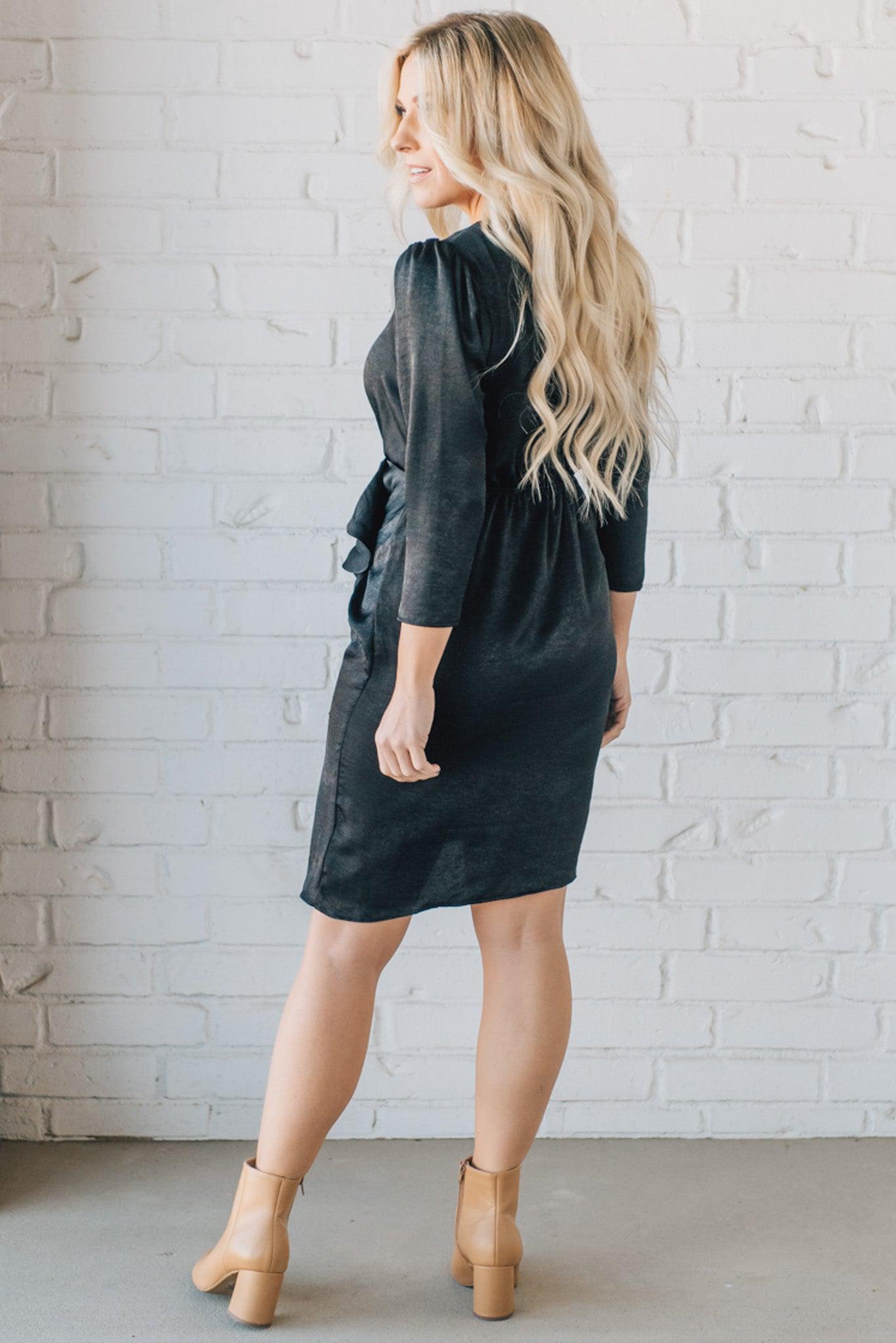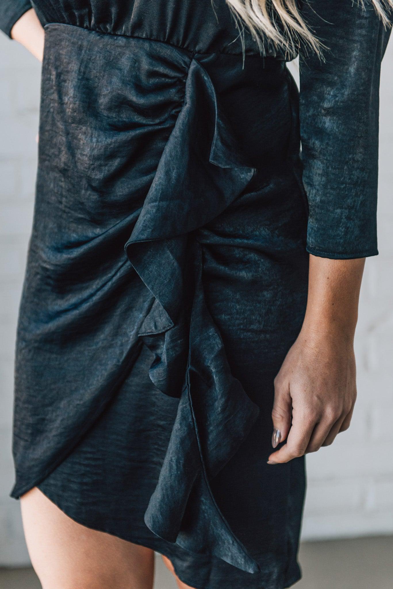 Such a darling Little Black Dress, with crushed satin finish, and side ruffle detailing. This adorable dress has a surplice skirt bottom for a super feminine fit. A subtle puff at the shoulder and 7/8 length sleeves.