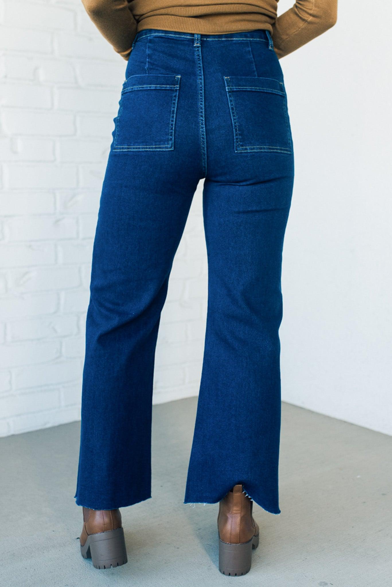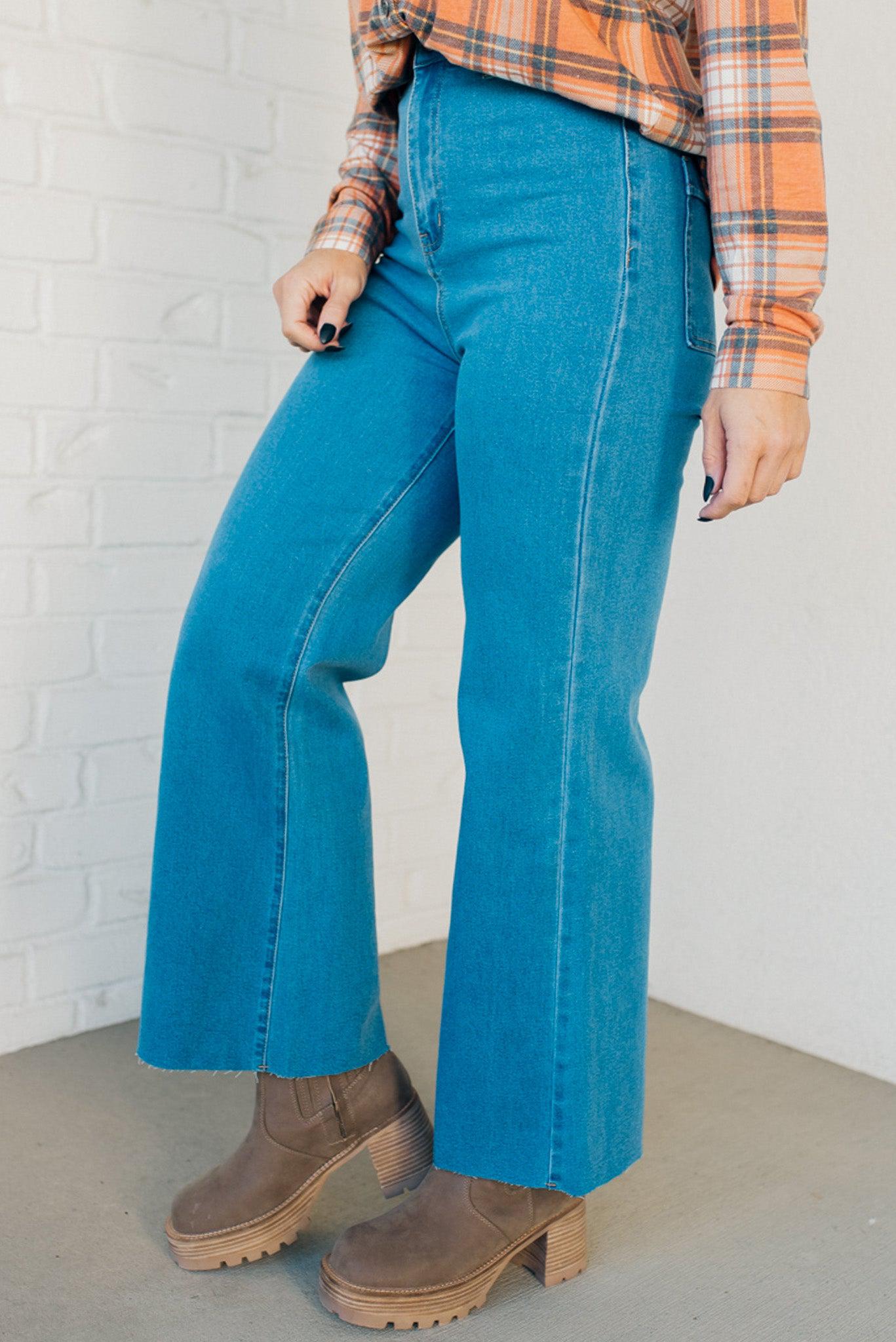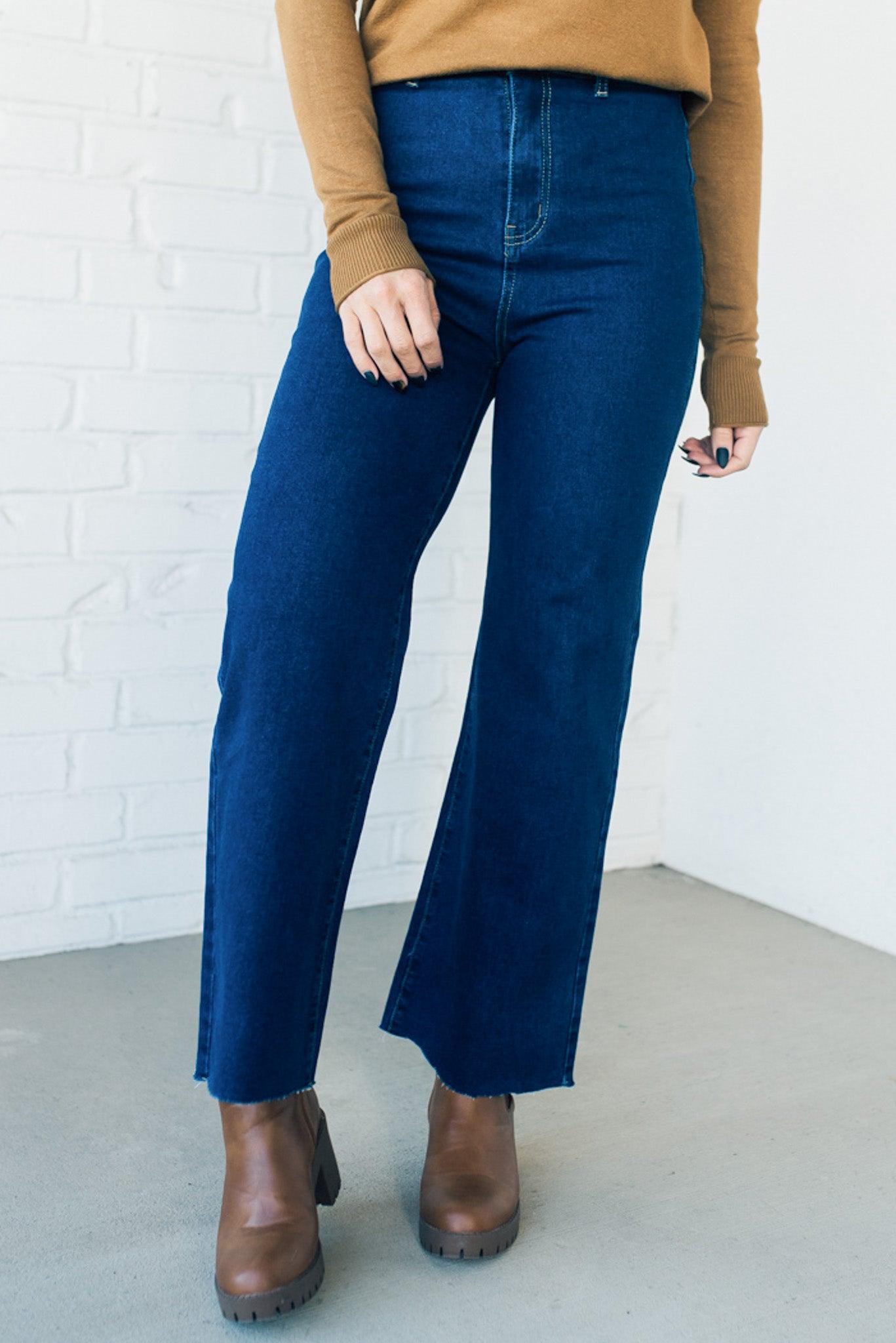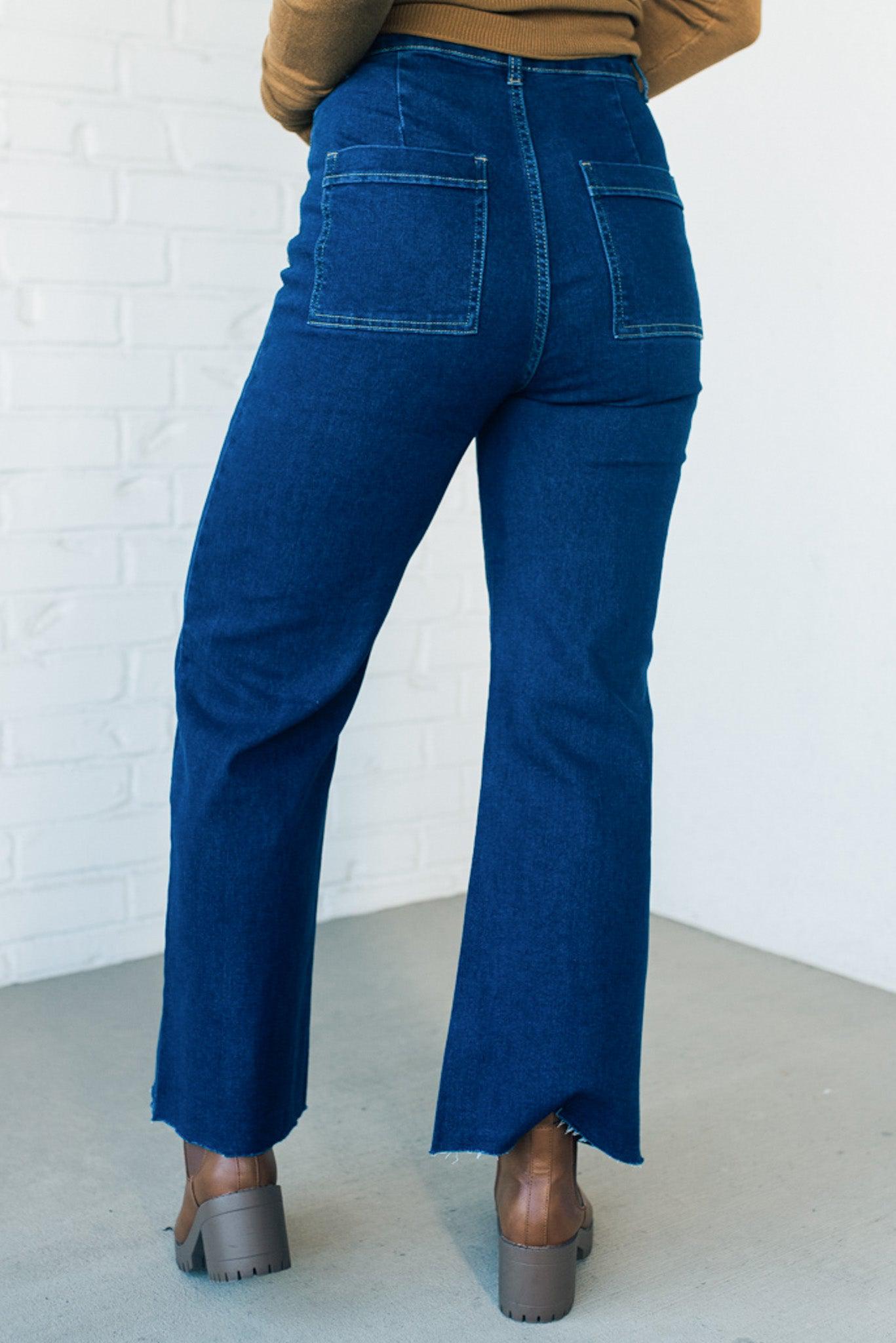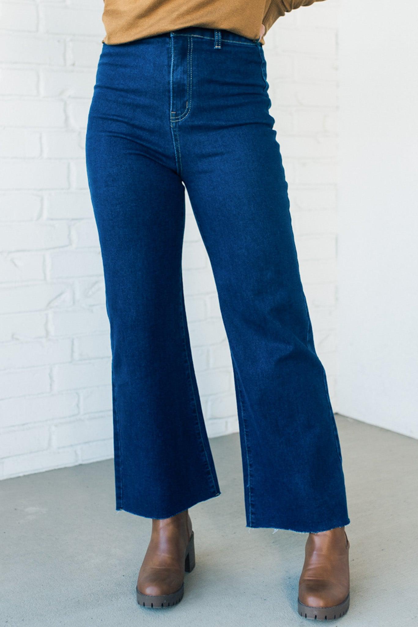 The Greta High Rise Wide Leg Denim offer a flattering fit and timeless style. Crafted from a stretchy material with an ultra high waist, slim cut, and wide leg, these pants provide a comfortable fit and chic silhouette. Features include belt loops and a classic blue finish.
