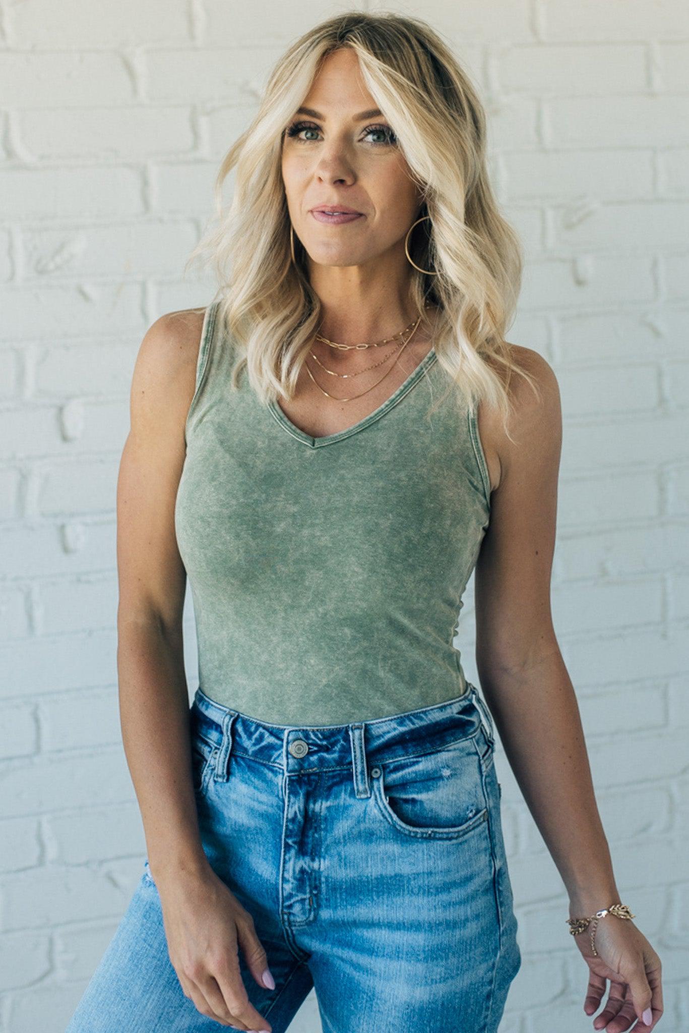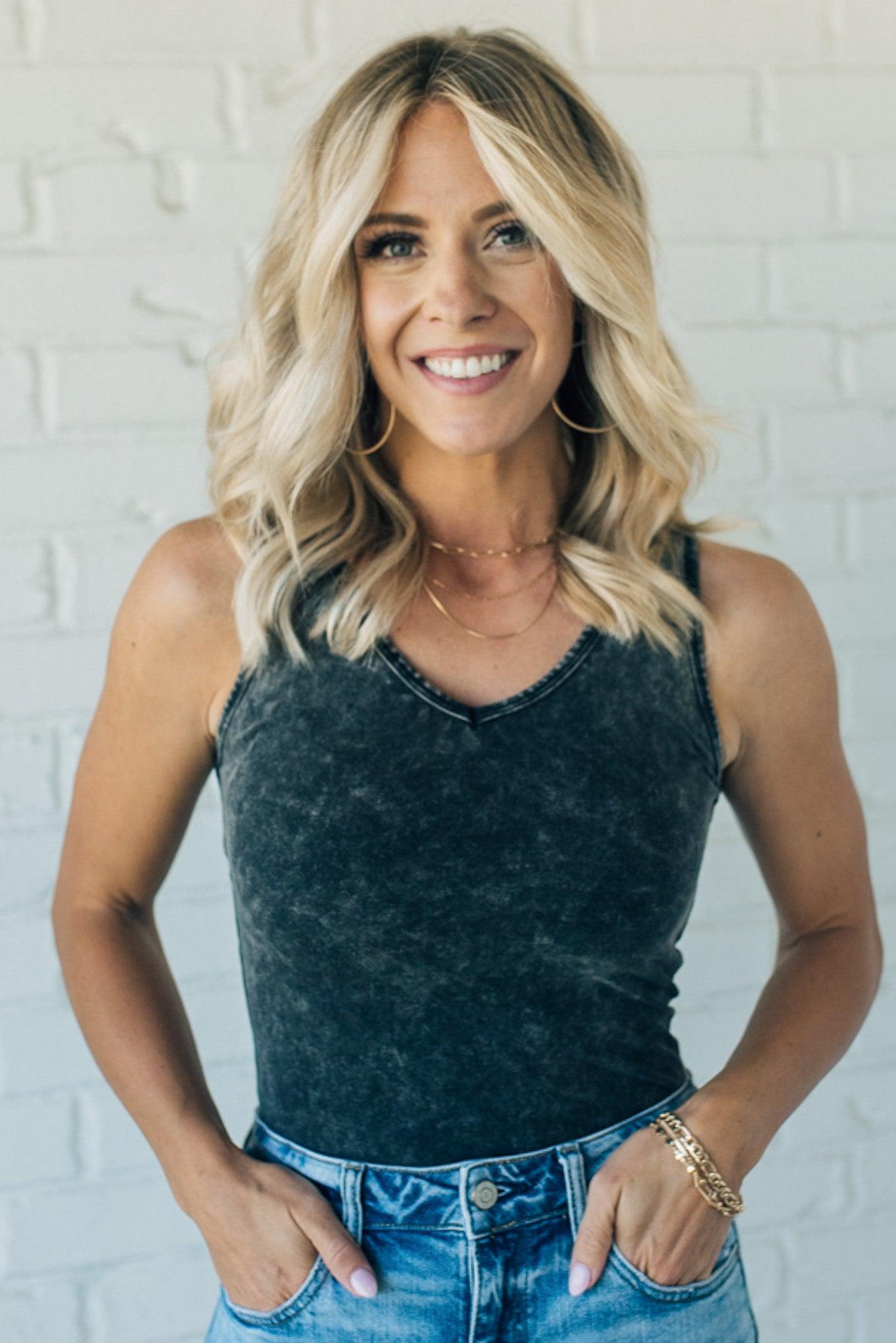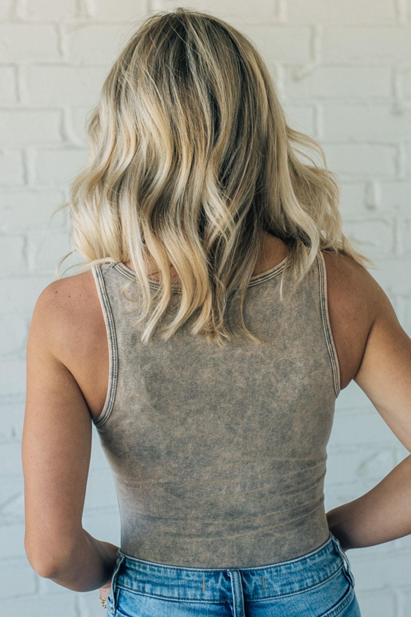 This Mineral Wash V-Neck Bodysuit offers a stylish take on the classic tank top silhouette. Crafted from a lightweight and stretchy acid-washed fabric. Underneath, this v-neck bodysuit features a double snap closure for a secure fit and full coverage. Perfect for any stylish wardrobe. If between sizes, we recommend sizing up.