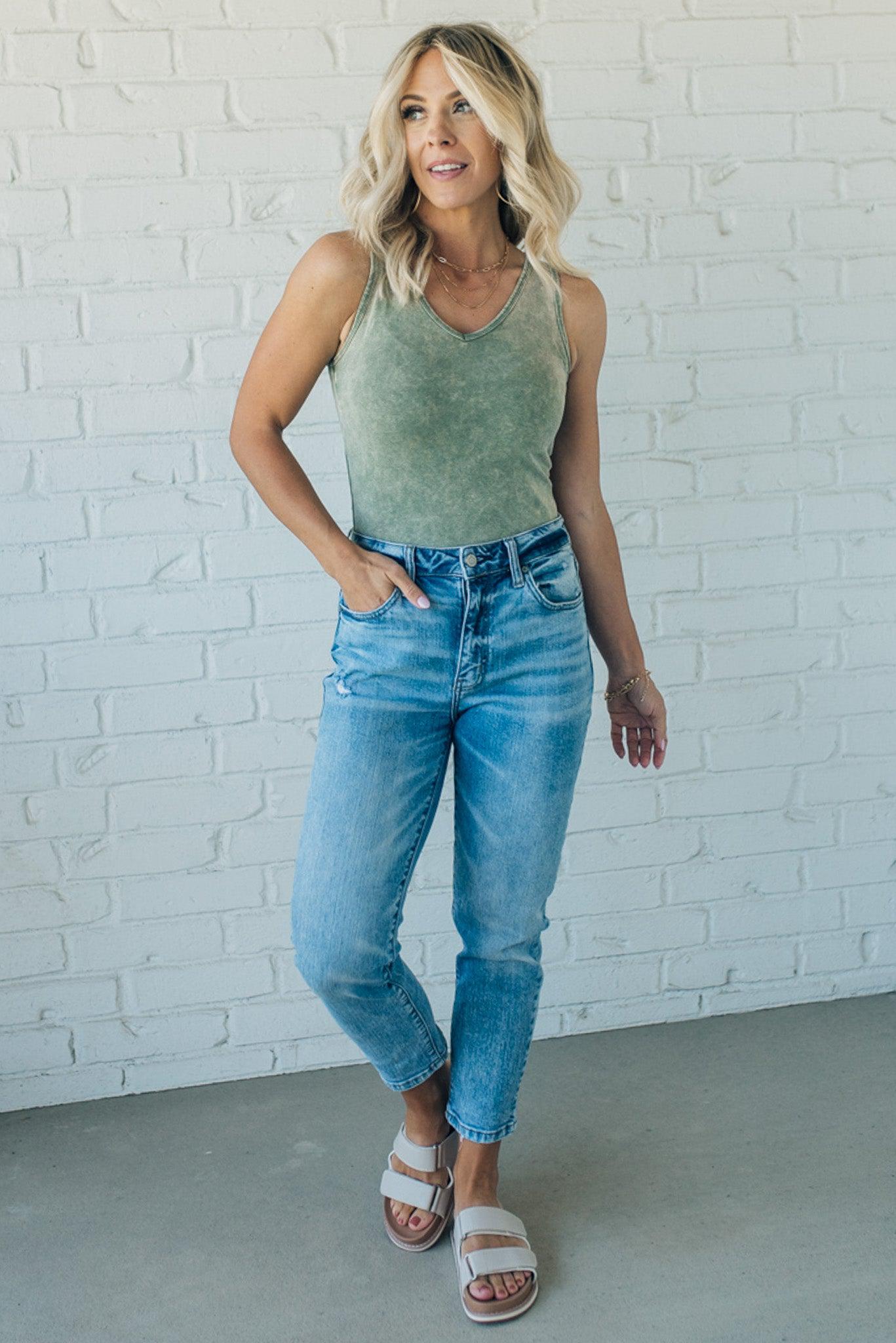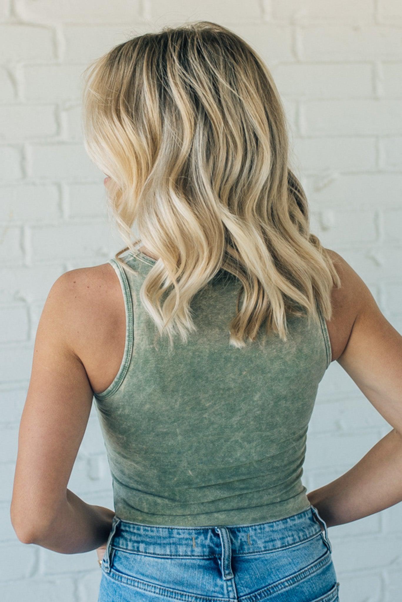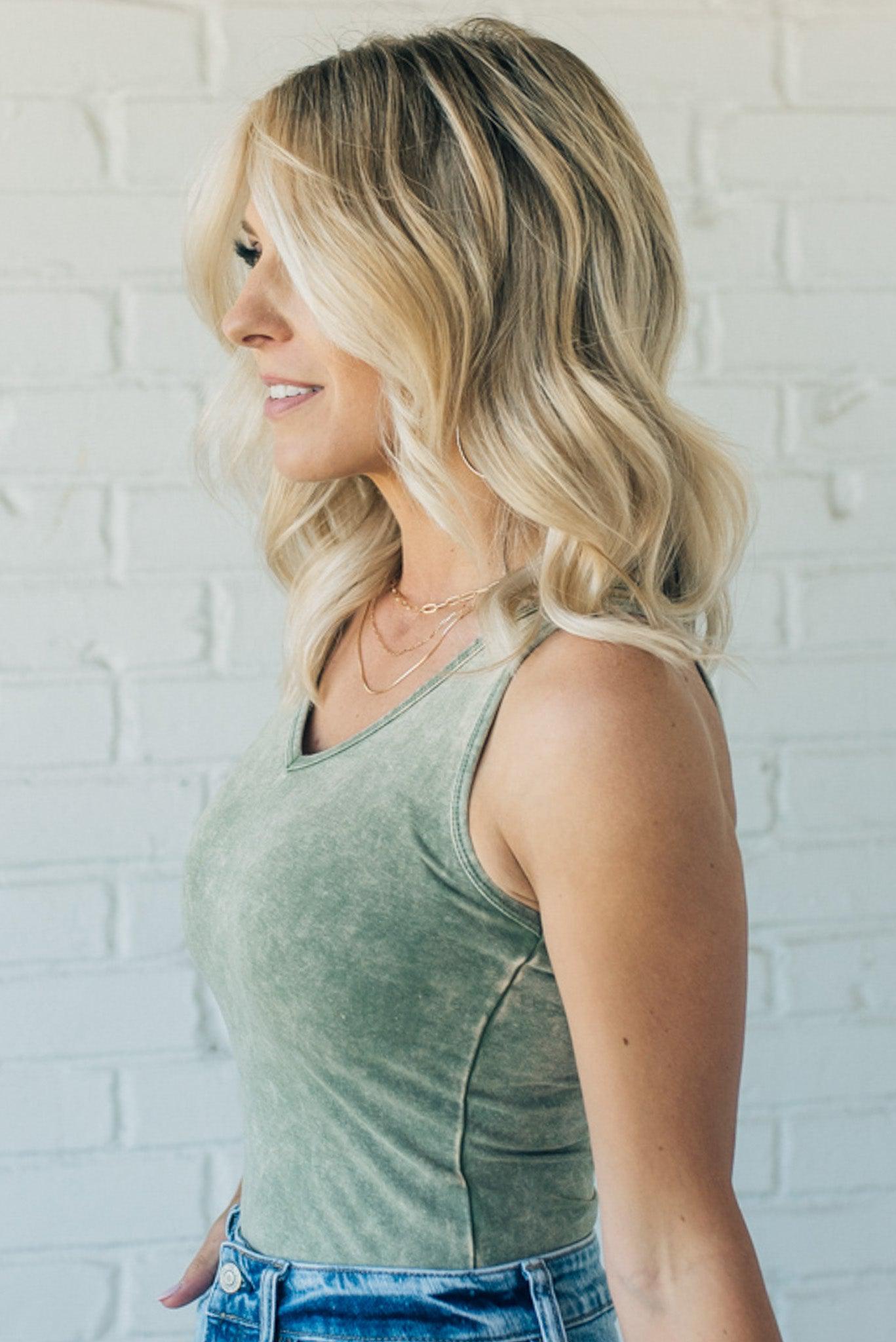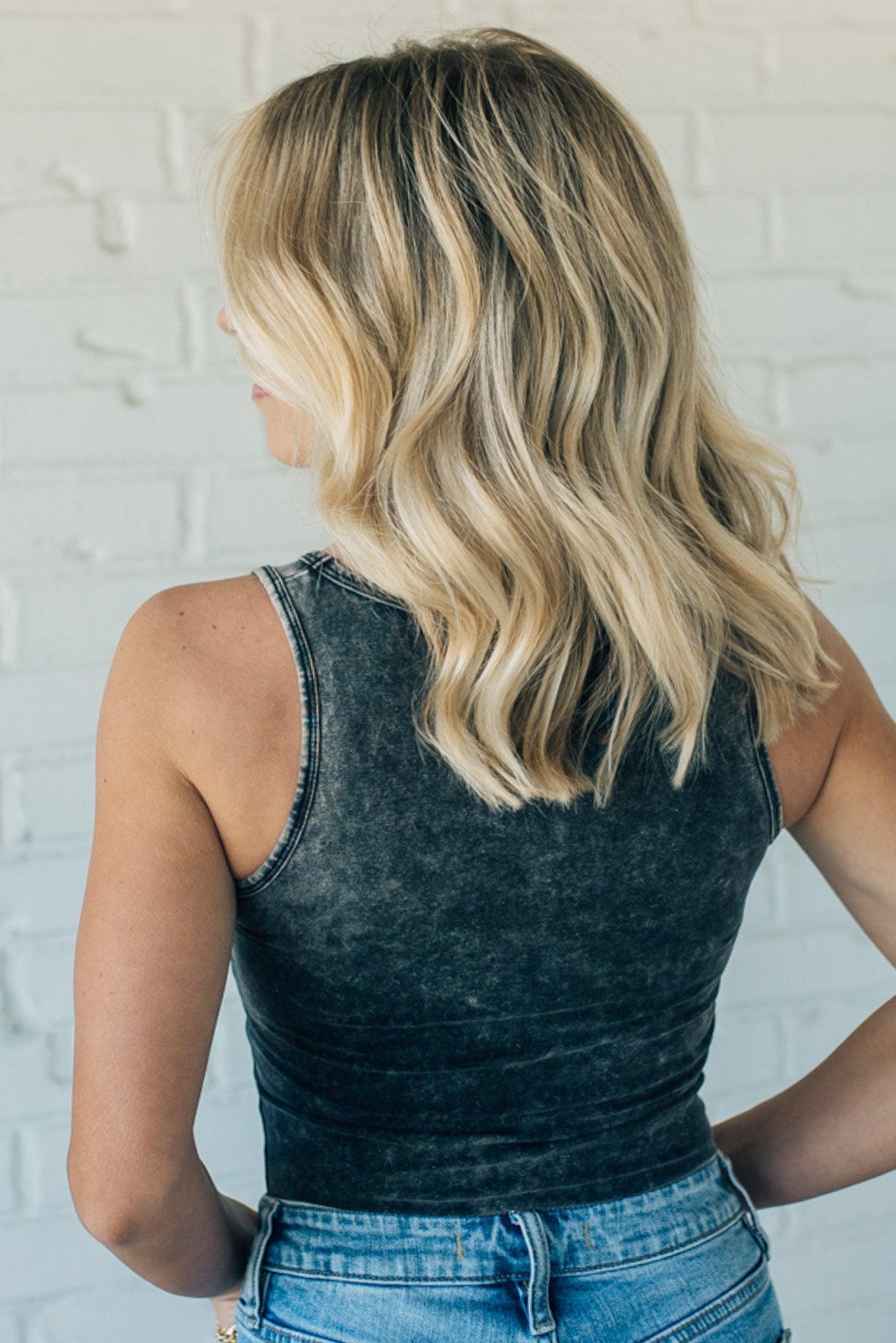 This Mineral Wash V-Neck Bodysuit offers a stylish take on the classic tank top silhouette. Crafted from a lightweight and stretchy acid-washed fabric. Underneath, this v-neck bodysuit features a double snap closure for a secure fit and full coverage. Perfect for any stylish wardrobe. If between sizes, we recommend sizing up.