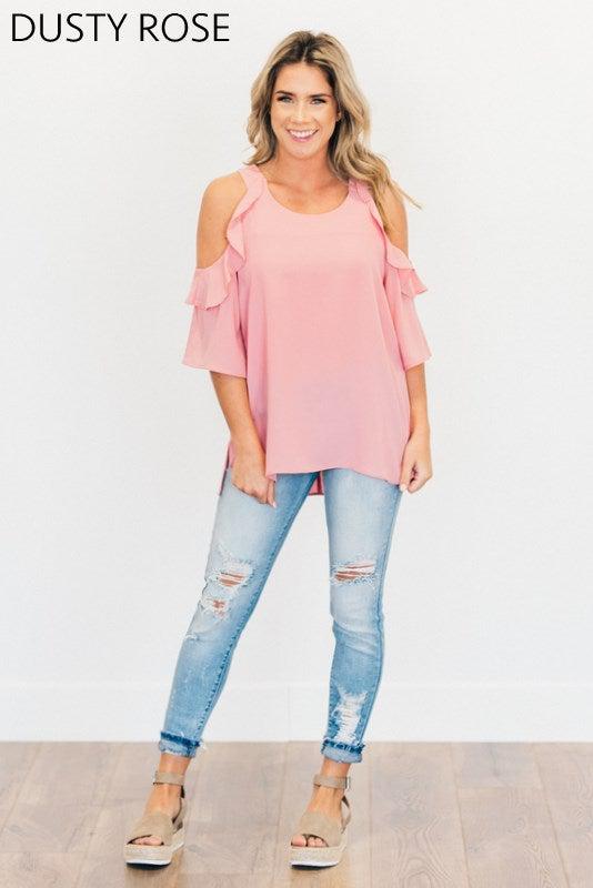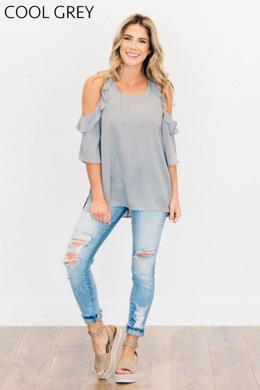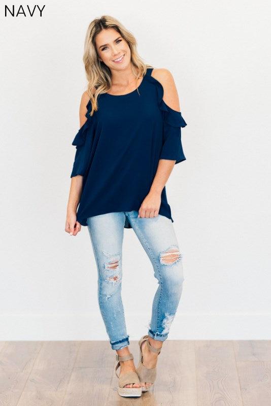 Cold shoulder style blouse, with ruffle detail for an extra touch of texture. The loose and flowy fit make this a breezy option for your dressed up looks!