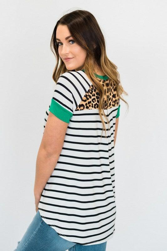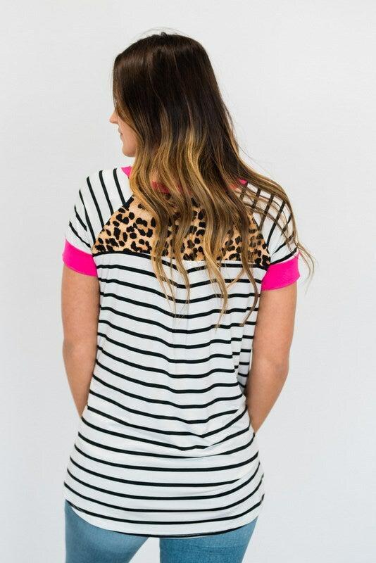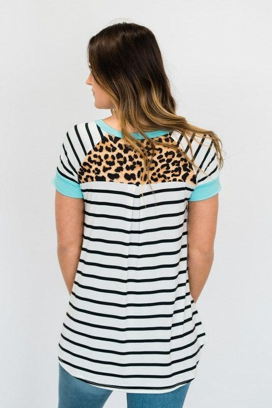Spice up your favorite tee with a pop of leopard! We all love a good raglan sleeve henley, but when you add in pattern mixing and pops of color, you take it to a whole new level!