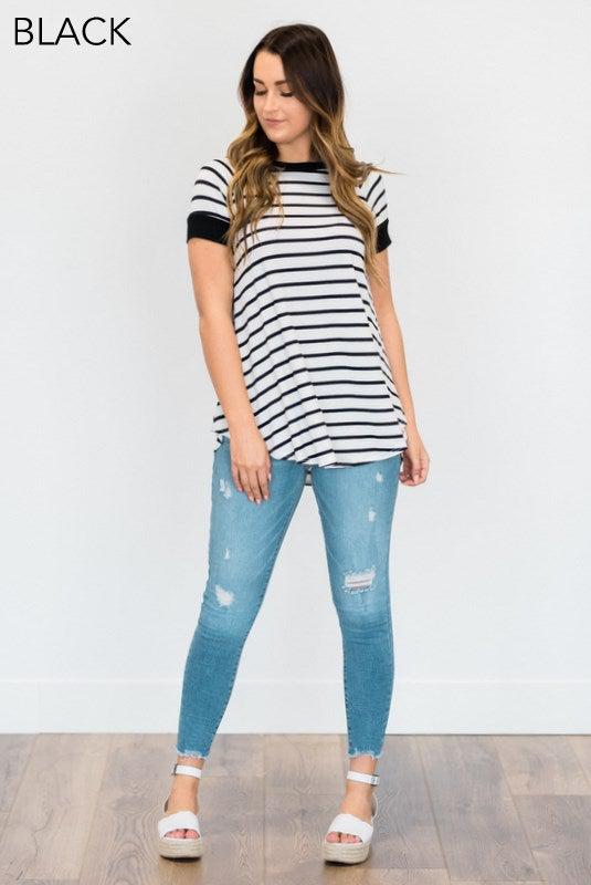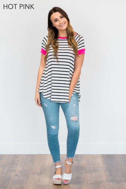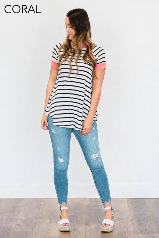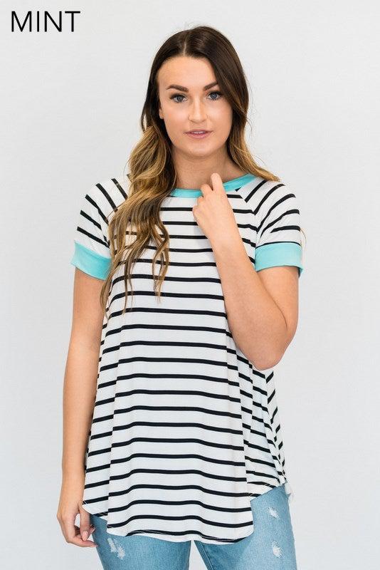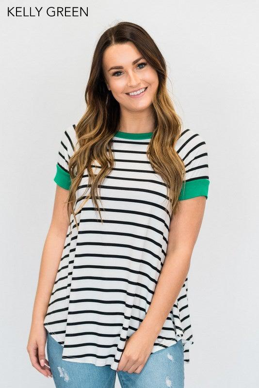 • Black + White Stripe with contrasting color on sleeve and neckline
