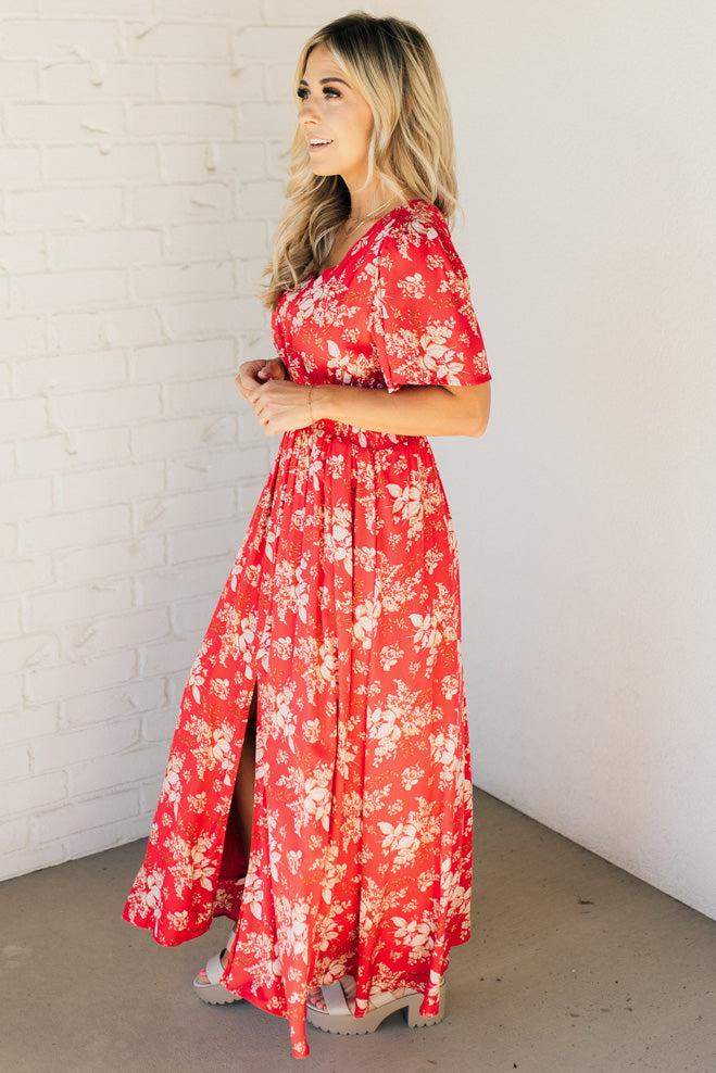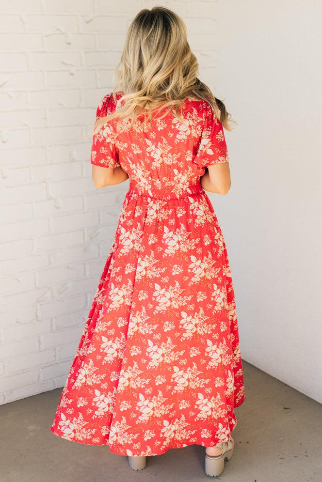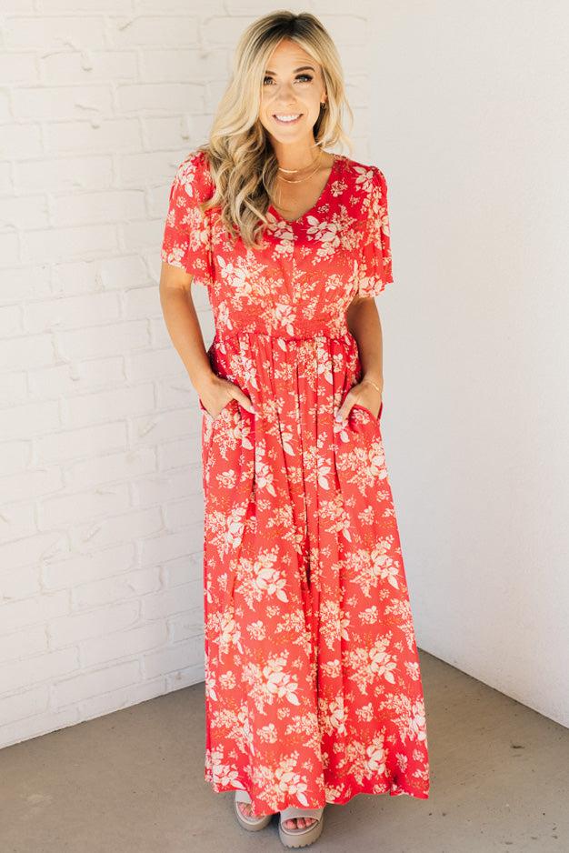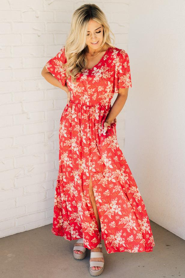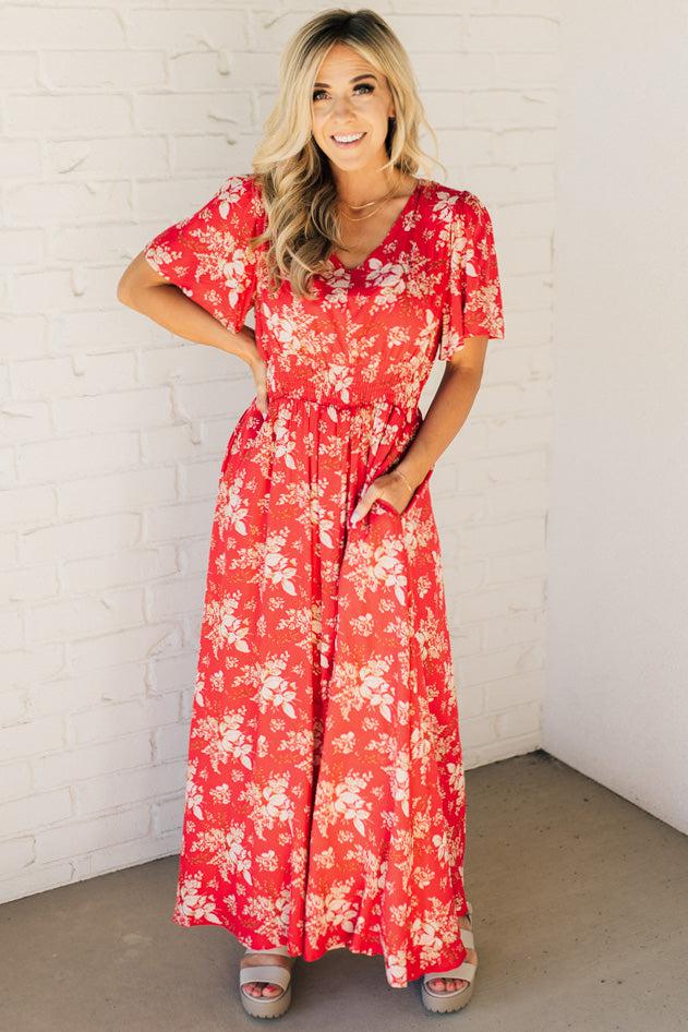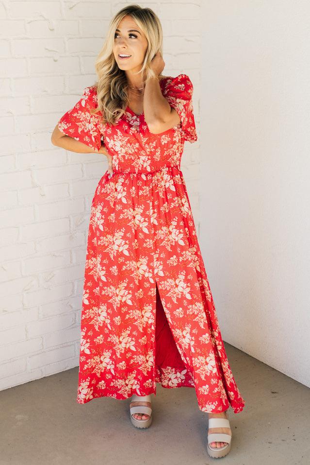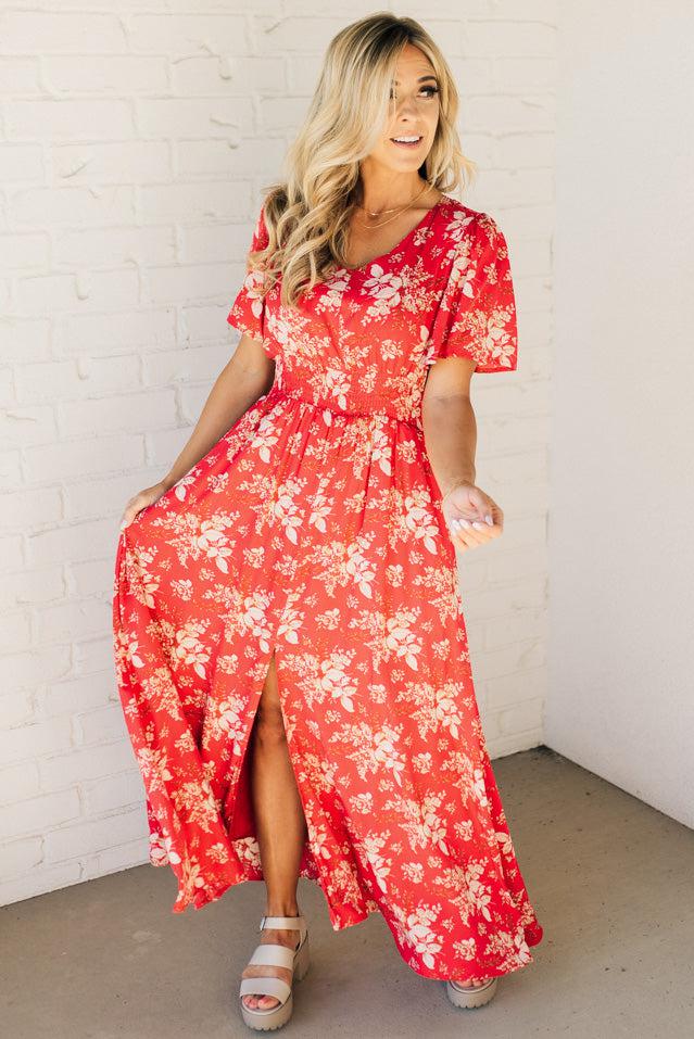 Pretty shade of bright red that we are dead over! This fun dress has a fully smocked waistline, with a center split front hem. The half, flowy sleeves are perfectly styled, and compliment the A-line shaped skirt of this beautiful dress!