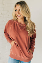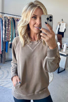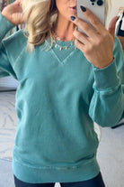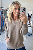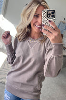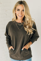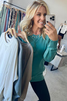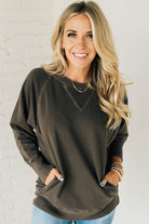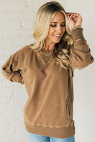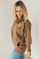 Dolman sleeved sweatshirt pullover with a ribbed detail thrown in for extra texture! Cozy, boyfriend fit makes this pullover easy to pair with denim to sweatpants! Contrast ribbing found along henley neckline, sides, cuff, and waistline!