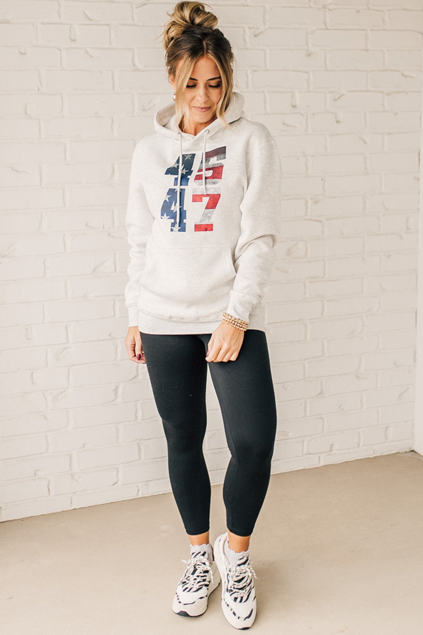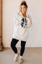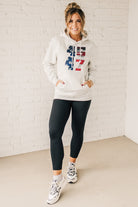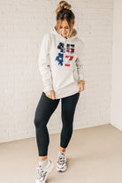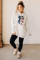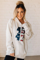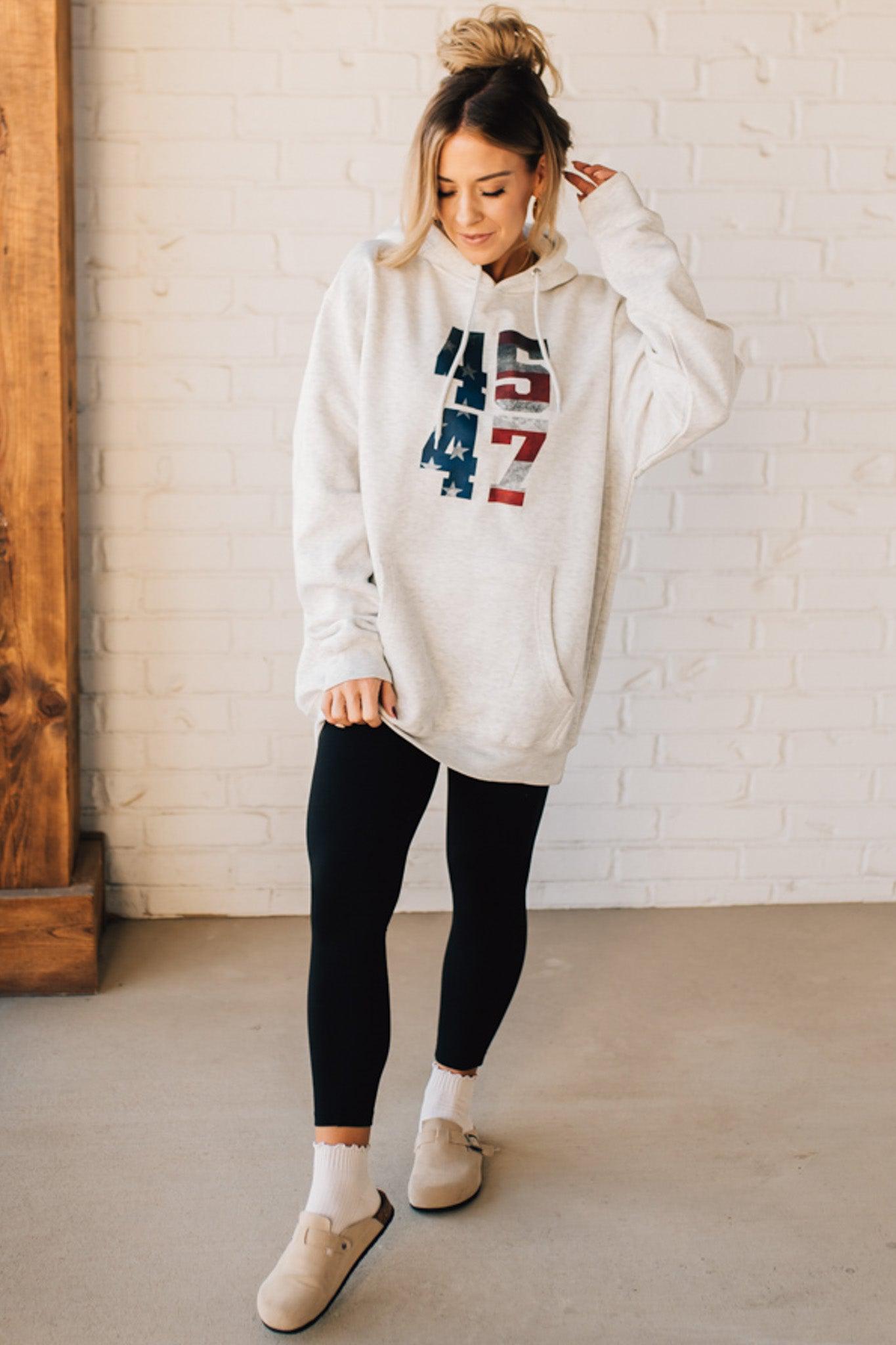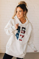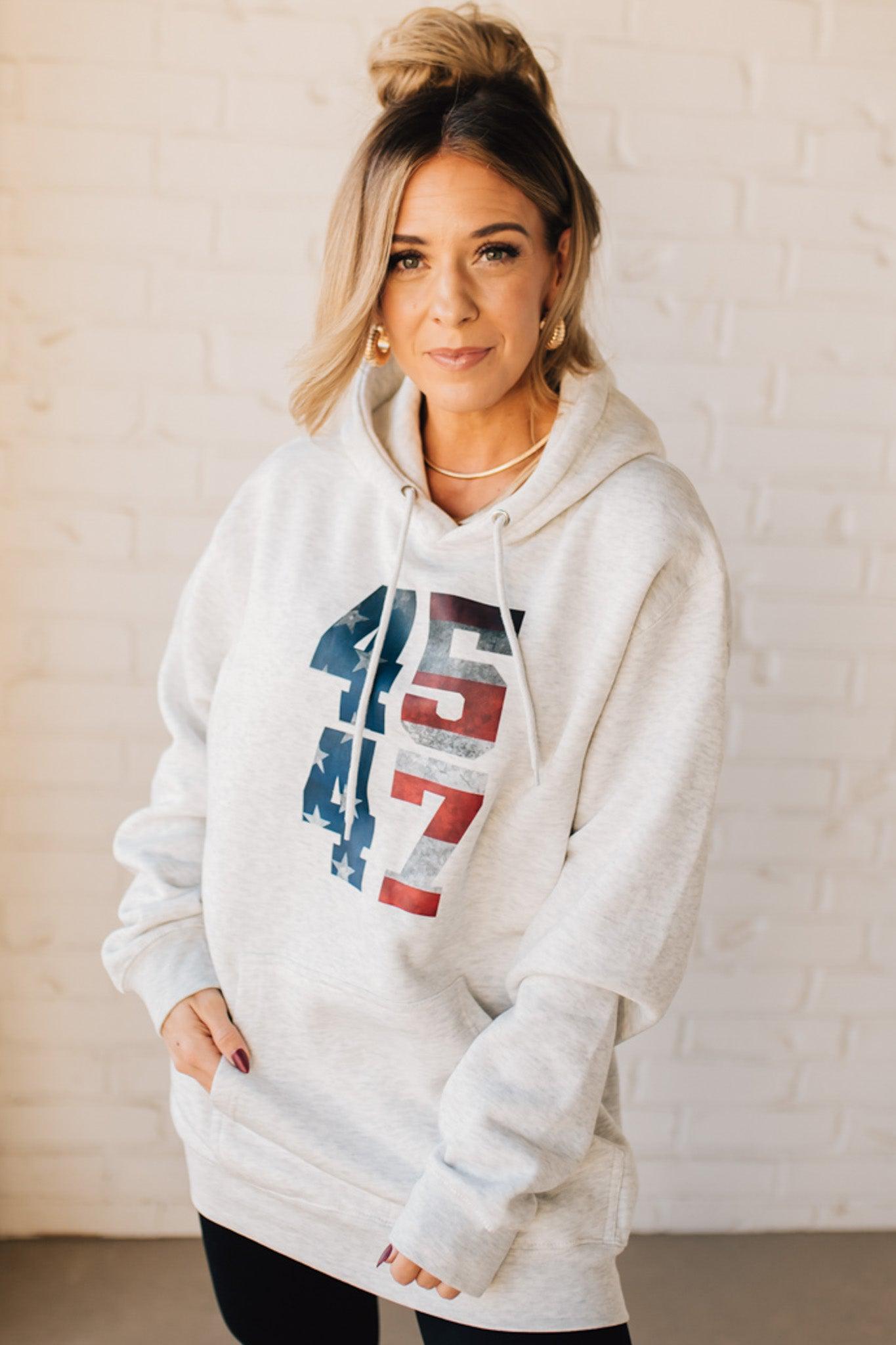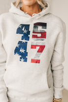 Stay cozy and patriotic in our 45/47 Fleece Hoodie. This light oatmeal sweatshirt features an oversized hood and front pocket for ultimate comfort, along with a functional drawstring. The red, white, and blue flag screenprinted with the numbers 45 and 47 adds a playful touch to this quirky and fun hoodie.