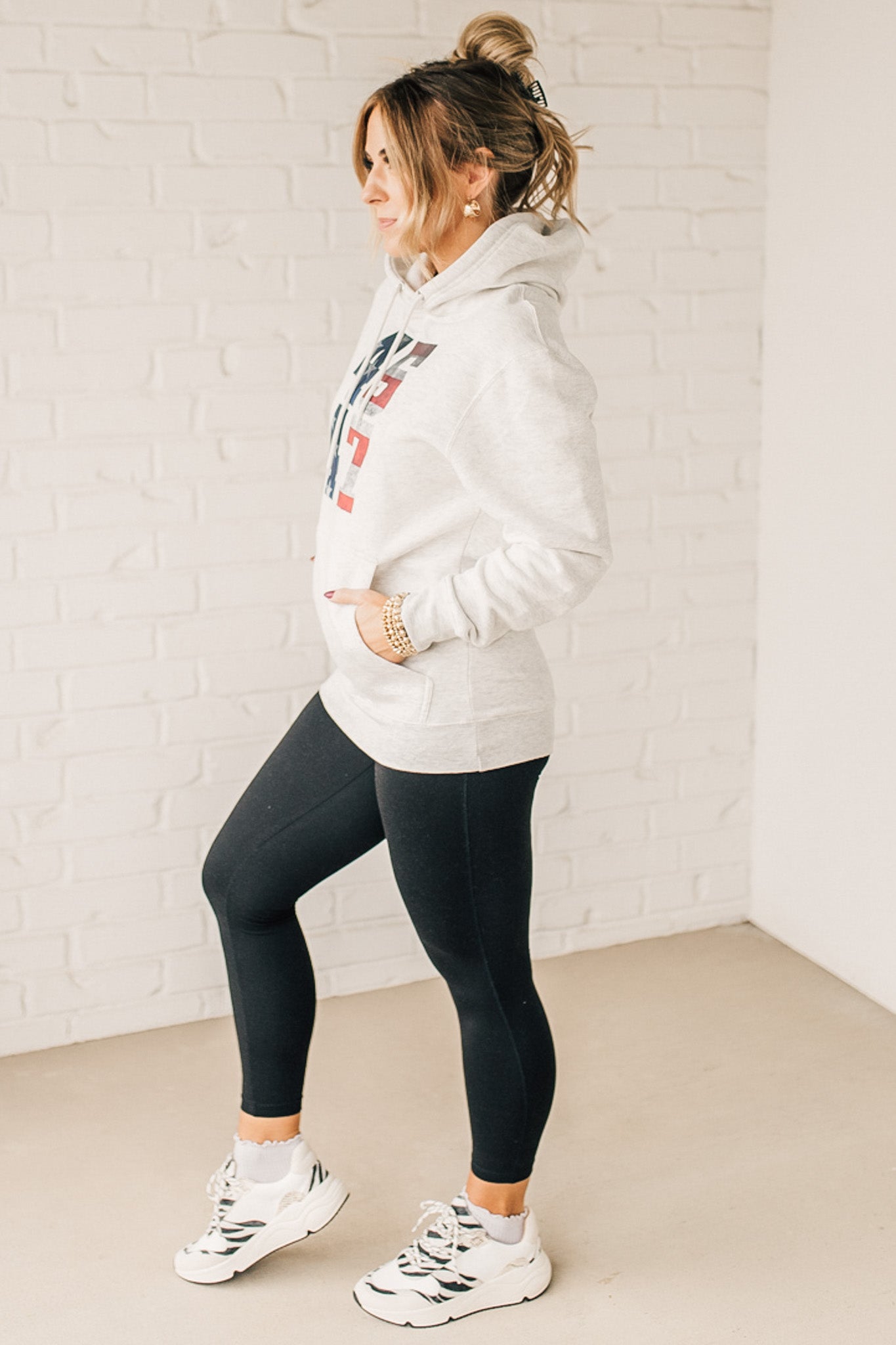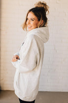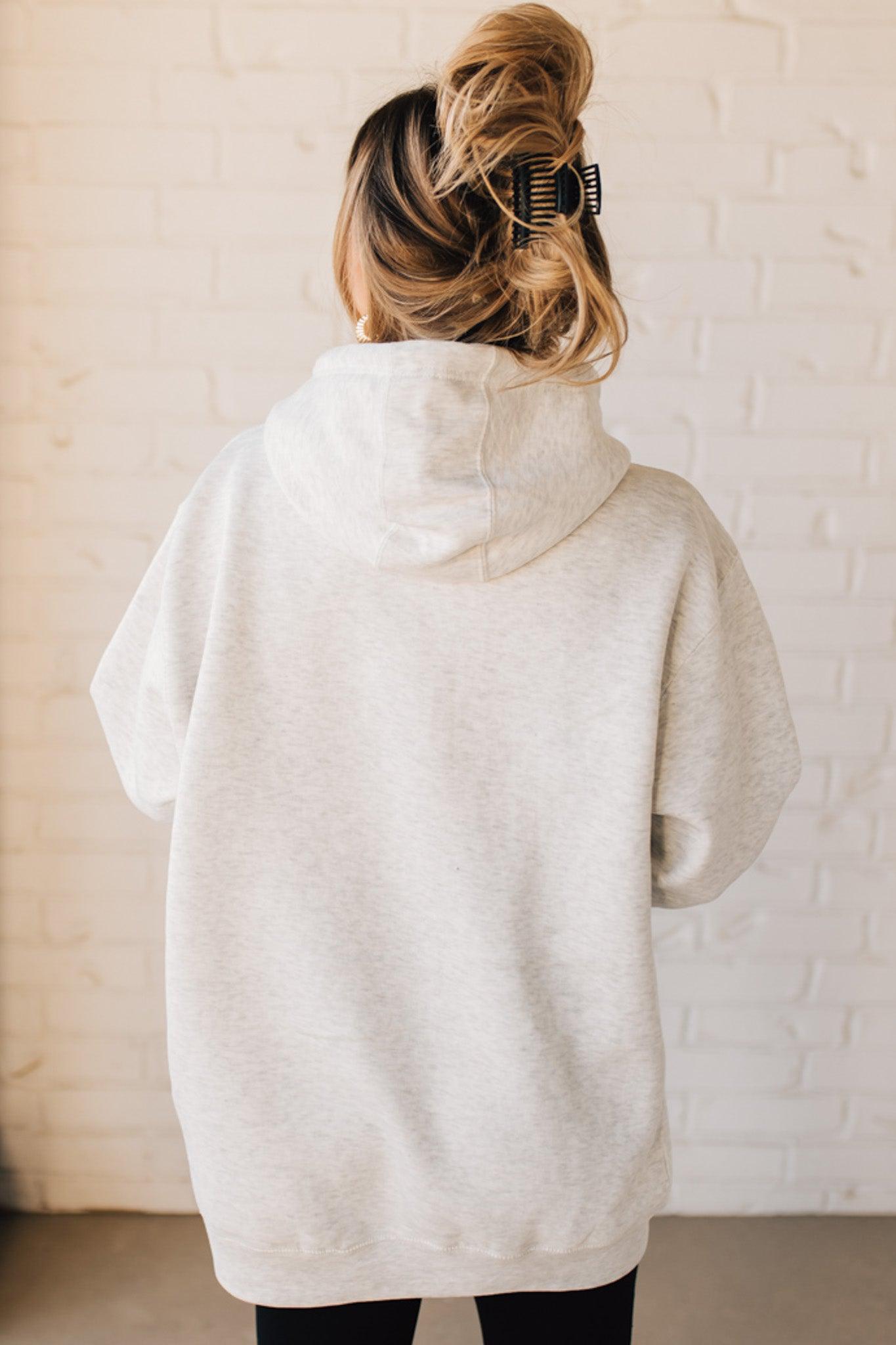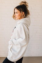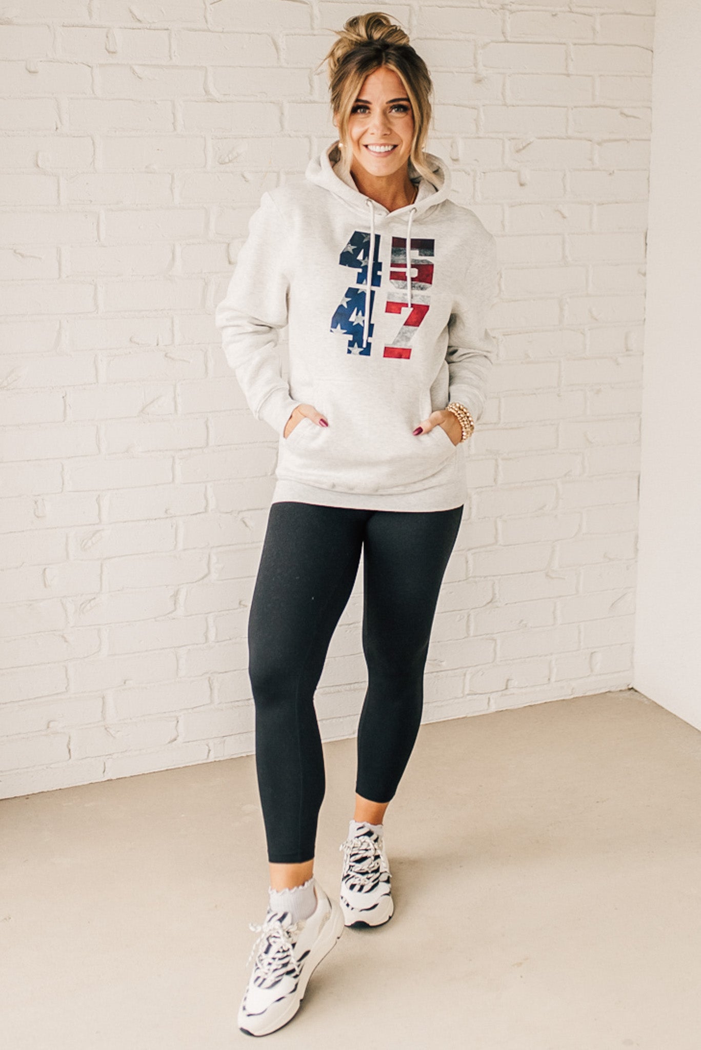Stay cozy and patriotic in our 45/47 Fleece Hoodie. This light oatmeal sweatshirt features an oversized hood and front pocket for ultimate comfort, along with a functional drawstring. The red, white, and blue flag screenprinted with the numbers 45 and 47 adds a playful touch to this quirky and fun hoodie.