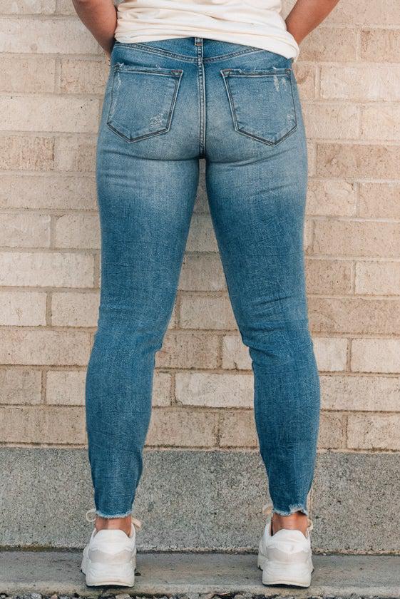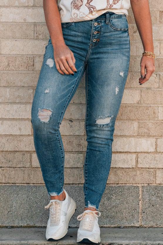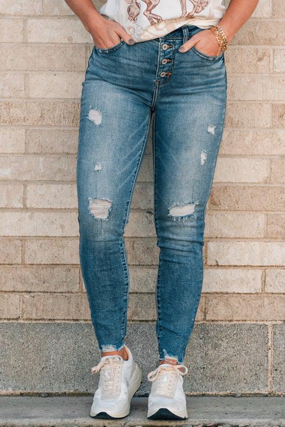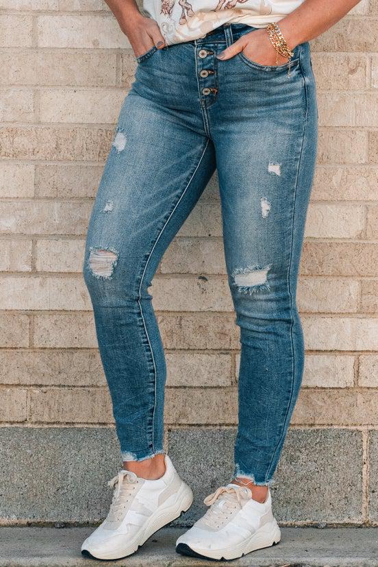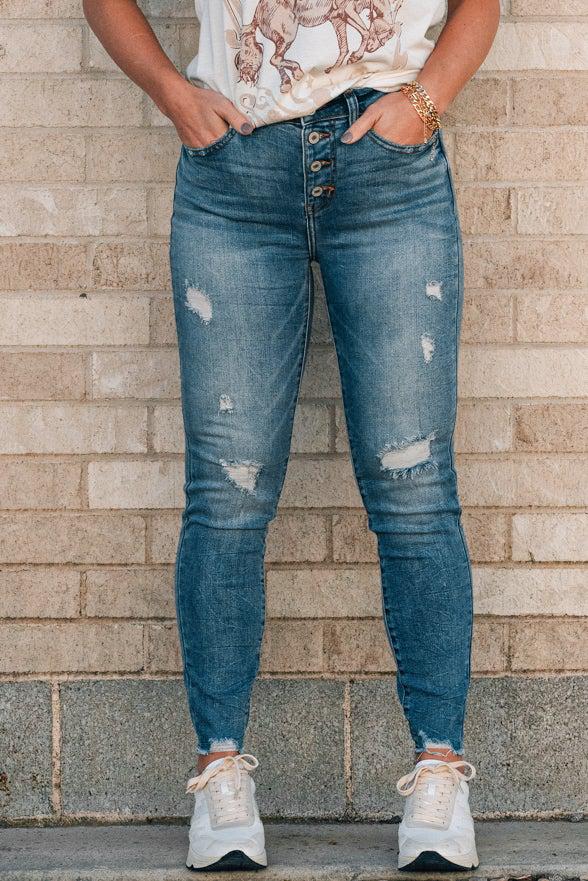 We are loving these button fly skinny jeans for every season! The medium stone wash paired with the distressed knees and cute frayed hem - you can't go wrong! She's perfect for pairing with all your favorite tops and blouses and with a half tuck you can show off those darling buttons!