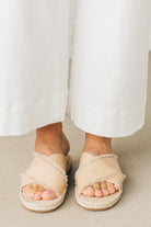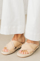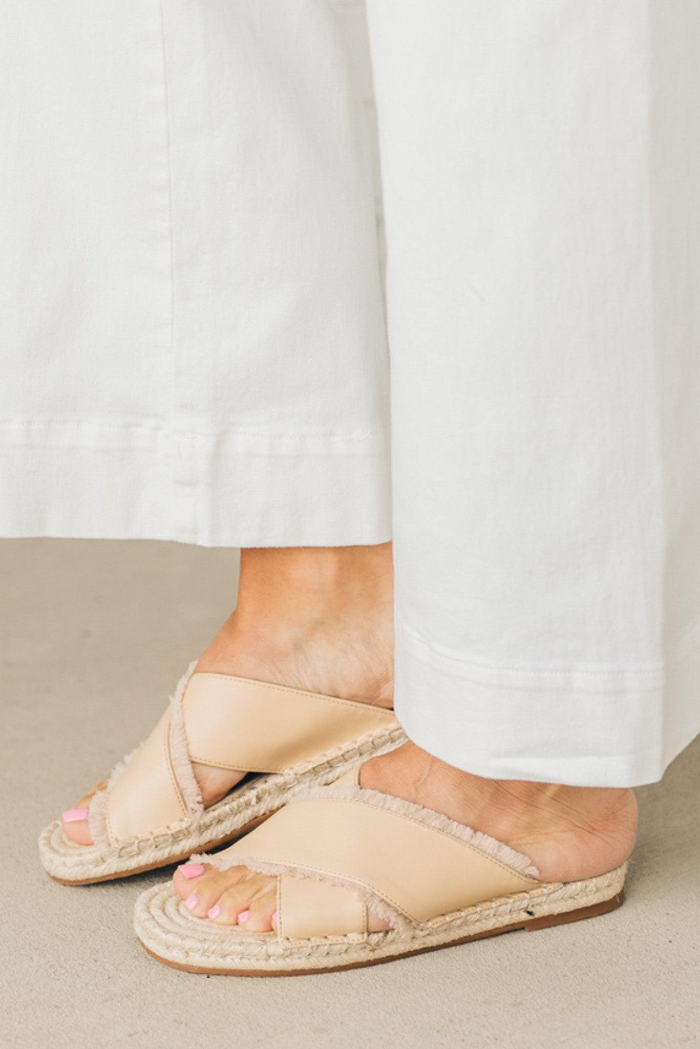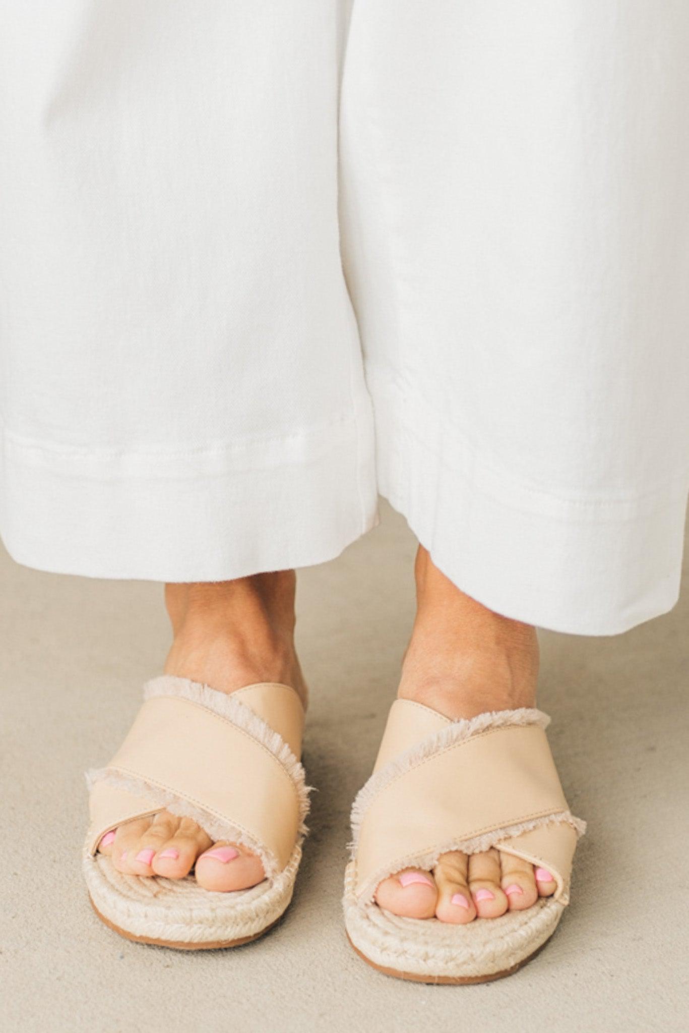 The Fern Criss Cross Espadrille Slides are the perfect summertime slide! With one strap featuring a frayed edge for a textured look and the other featuring a polished finish, you will always look put together. The soft woven footbed ensures maximum comfort, making them perfect for all-day wear.