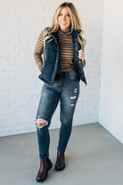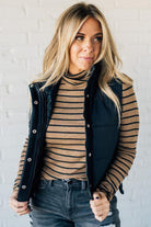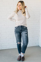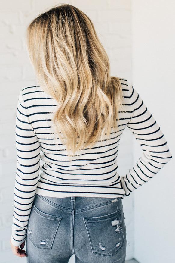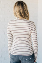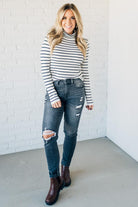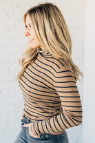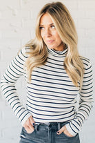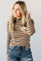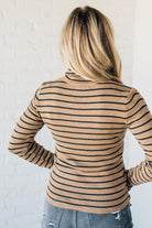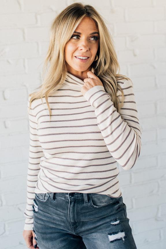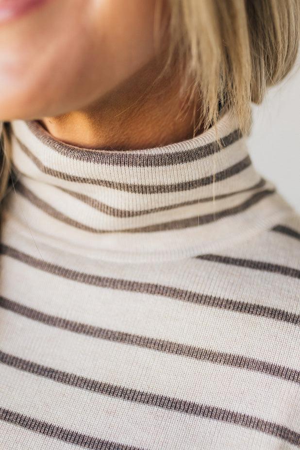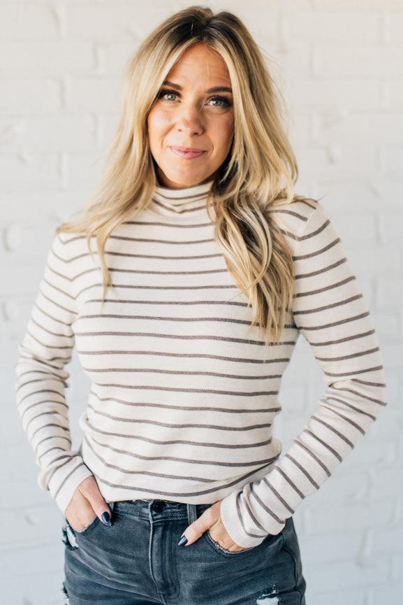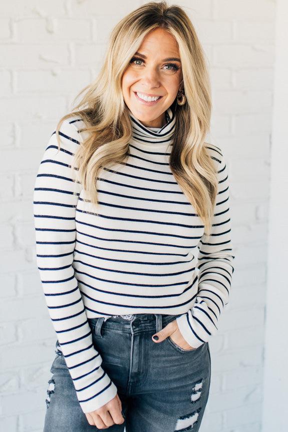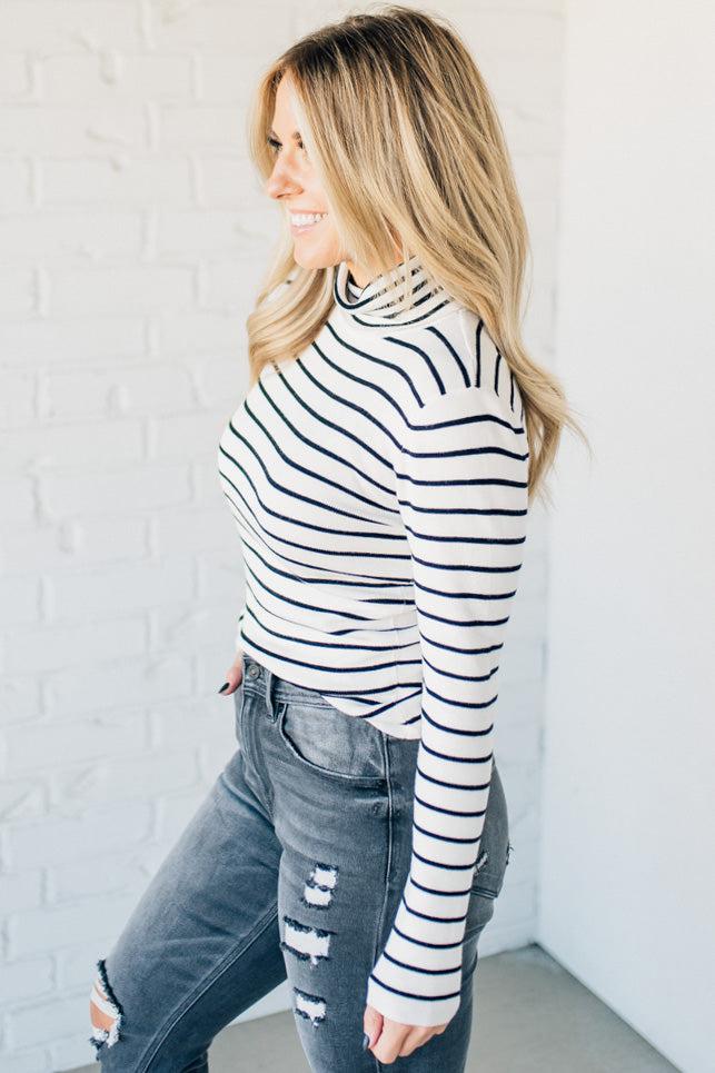 Stay cozy and stylish with our Tate Striped Turtleneck Top. This classic cut sweater features long sleeves and a fitted silhouette, with an on-trend turtle neck and thin striped pattern. Perfect for layering, this top is a must-have for your fall and winter wardrobe. (Sweater weather, here we come!)